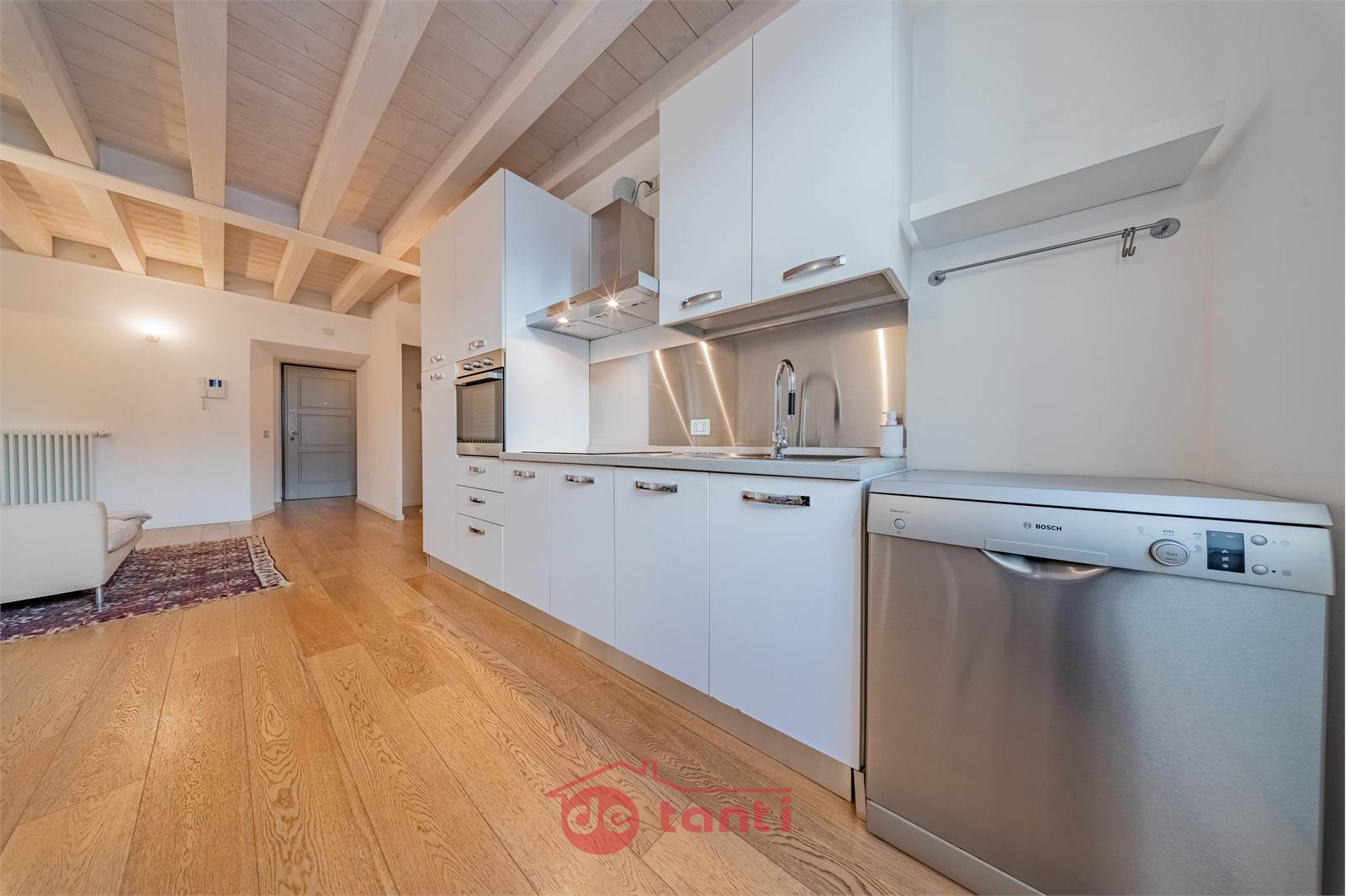 L’appartamento accoglie con una zona giorno luminosa, valorizzata da travi a vista e parquet caldo, con affaccio diretto su via Paolo Bossi. La cucina a vista dialoga in modo naturale con il living, creando uno spazio conviviale, funzionale e già pronto all’uso.