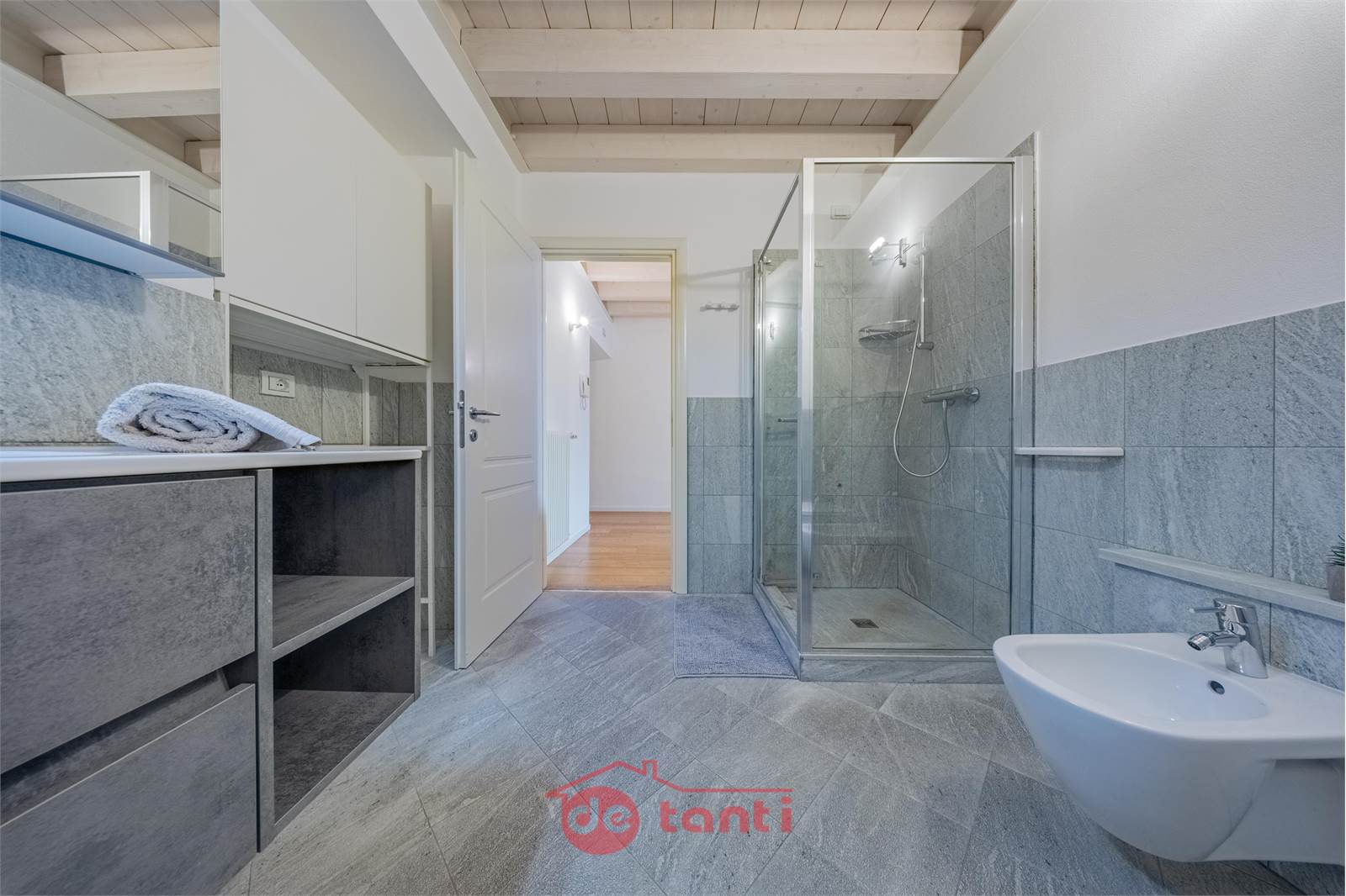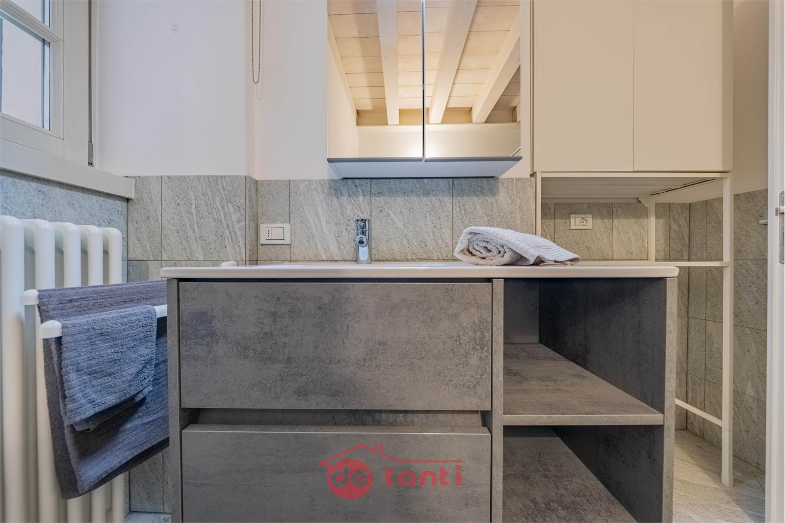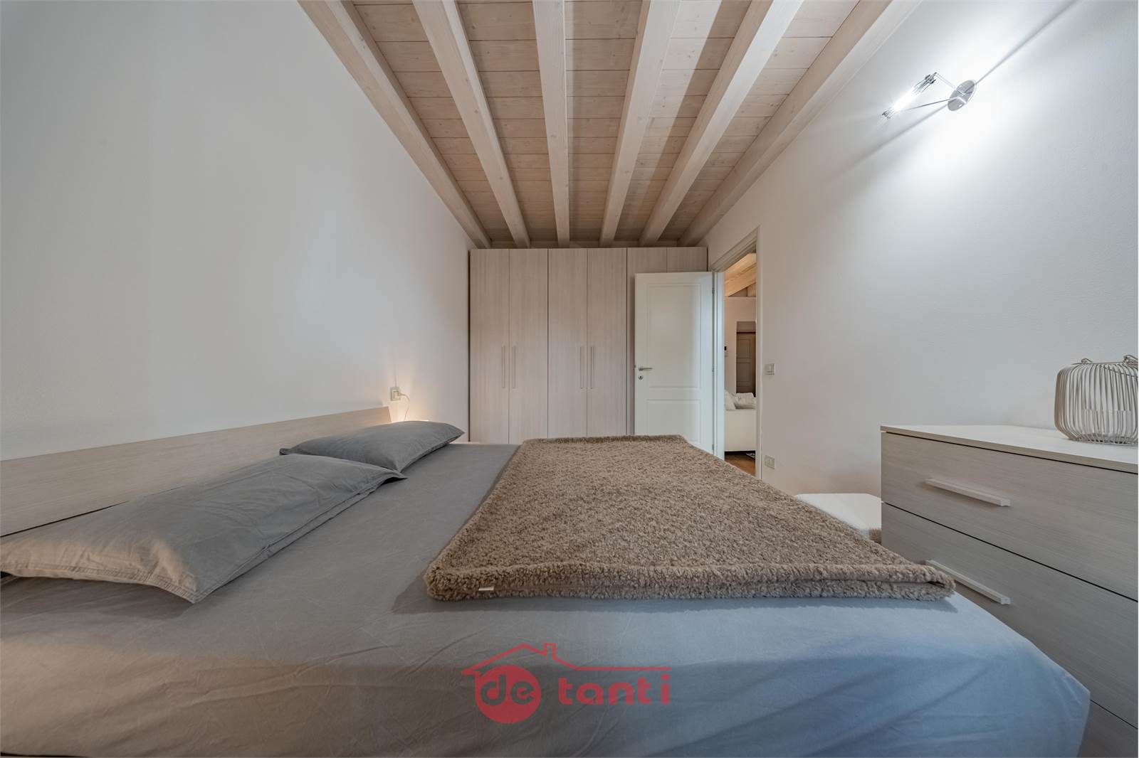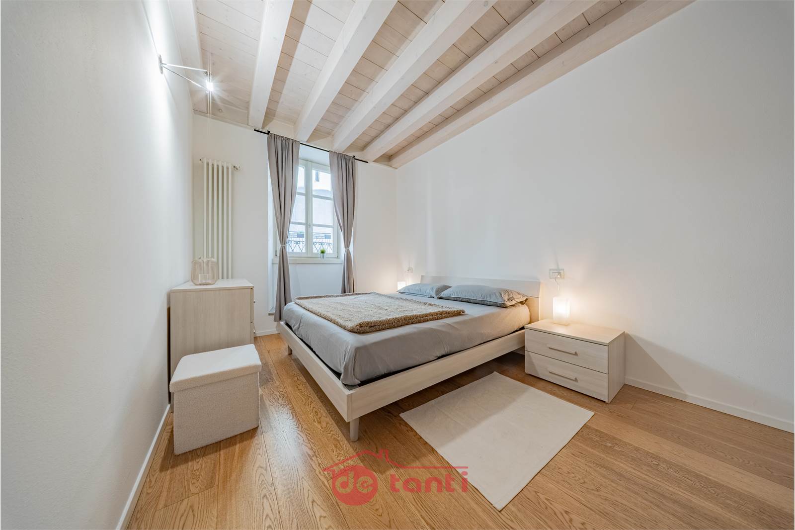 La camera matrimoniale, ampia e ben illuminata, è dotata di un’armadiatura importante, un dettaglio tutt’altro che scontato che rende la casa immediatamente pratica e ordinata. Il disimpegno consente di gestire giacche e scarpe senza invadere la zona giorno, mentre il bagno in pietra, con angolo lavanderia, aggiunge quel livello di comfort che nel centro storico fa davvero la differenza.