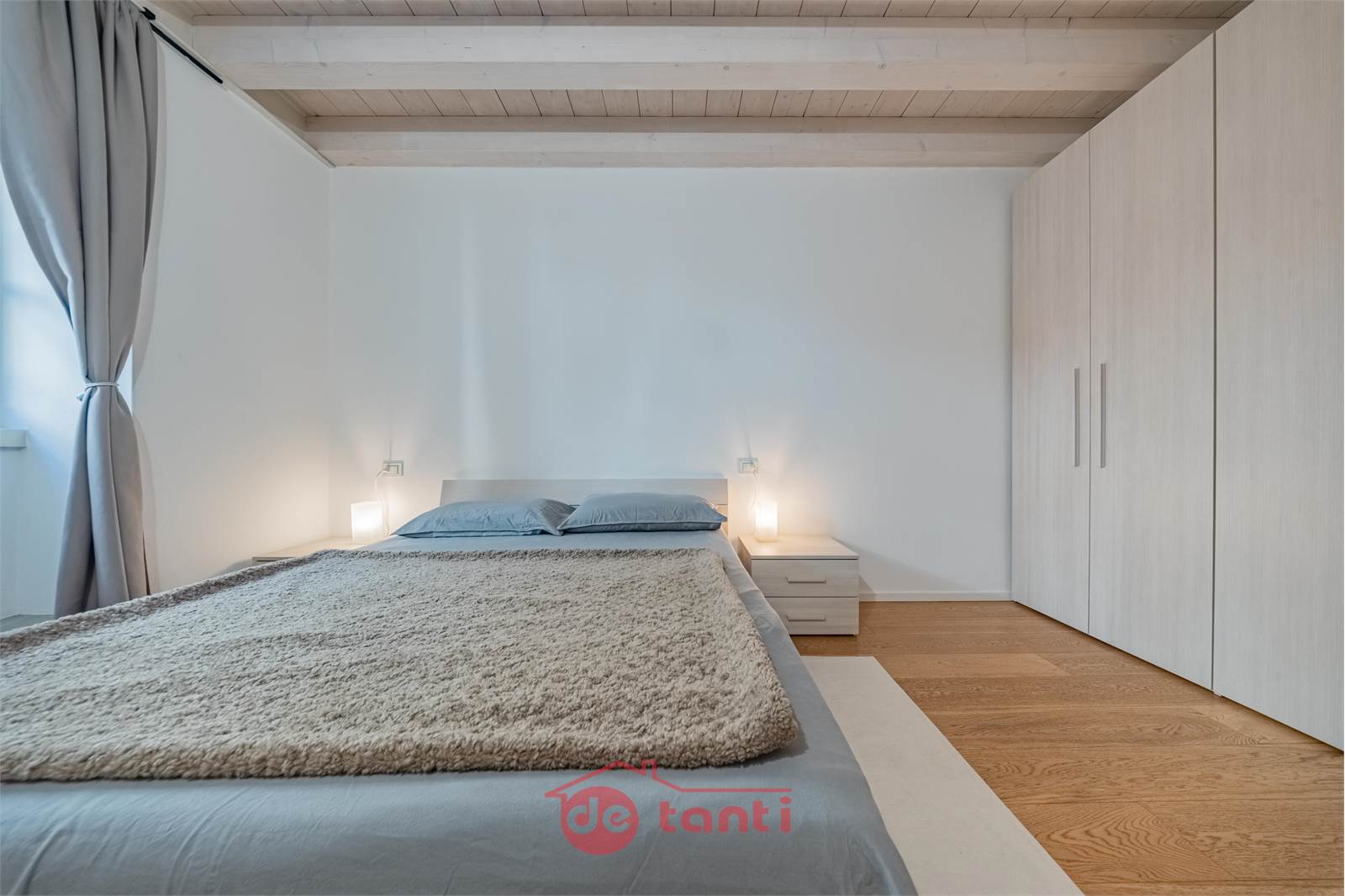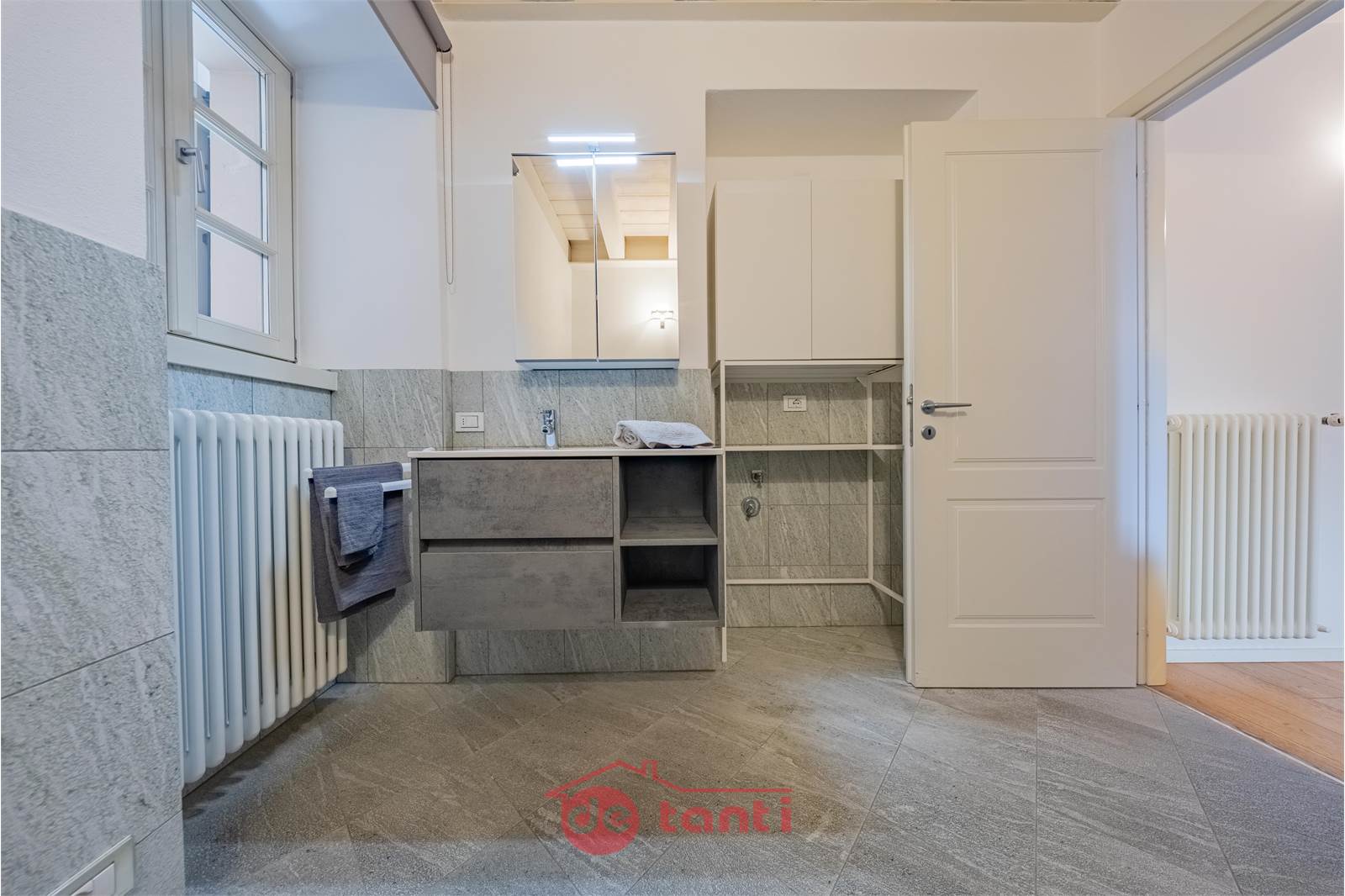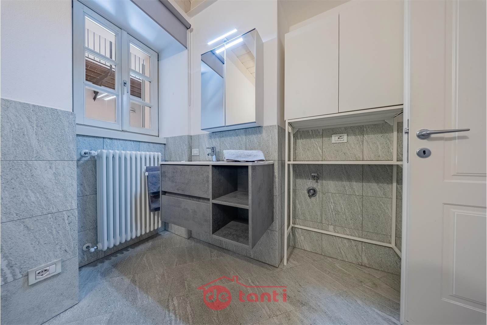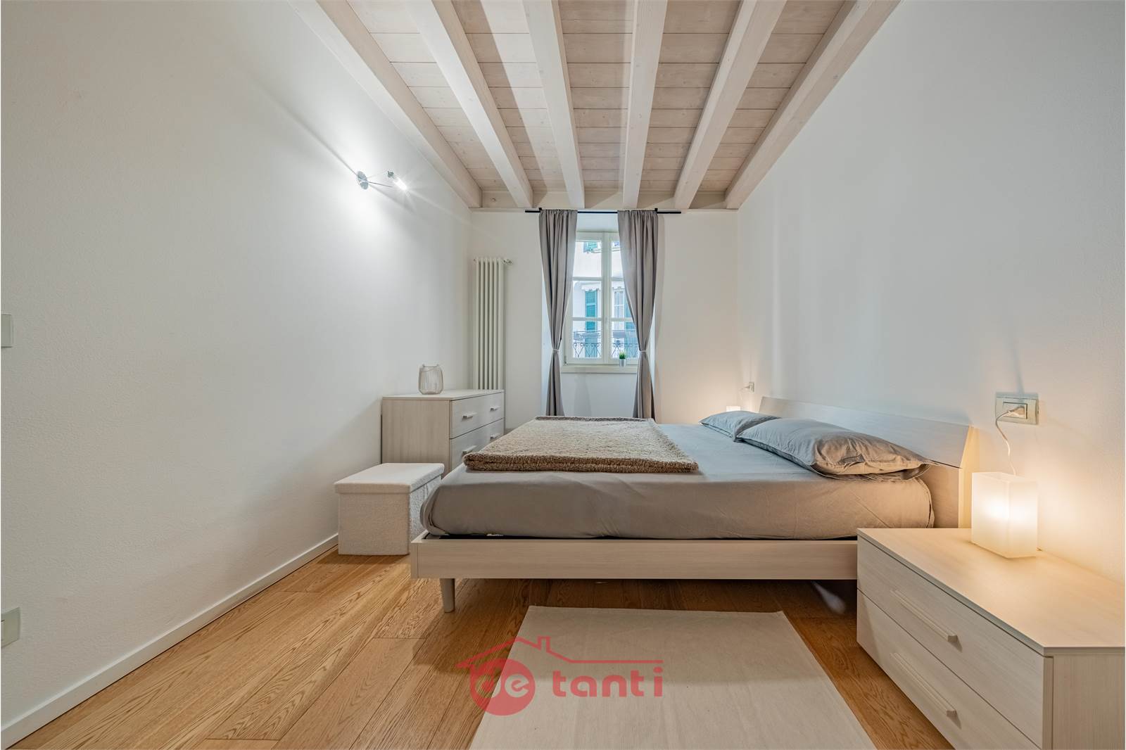 La camera matrimoniale, ampia e ben illuminata, è dotata di un’armadiatura importante, un dettaglio tutt’altro che scontato che rende la casa immediatamente pratica e ordinata. Il disimpegno consente di gestire giacche e scarpe senza invadere la zona giorno, mentre il bagno in pietra, con angolo lavanderia, aggiunge quel livello di comfort che nel centro storico fa davvero la differenza.