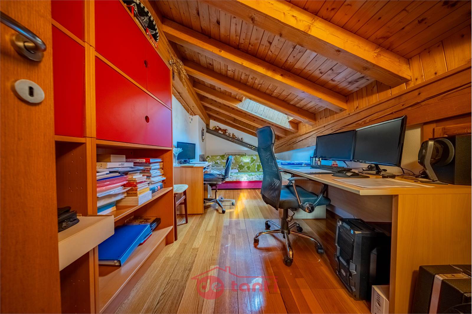 La camera matrimoniale è un rifugio caldo e silenzioso: pavimento in parquet, travi che accarezzano lo sguardo e un bagno en suite con vasca idromassaggio per concedersi il lusso di fermarsi. Salendo la scala in legno, il soppalco sorprende con il suo caminetto in pietra funzionante, un angolo di quiete e intimità che sa adattarsi a ogni esigenza: uno spazio per leggere, per lavorare, per accogliere un ospite o trasformarsi nella cameretta di un figlio. Un secondo bagno completa il piano con la discrezione di chi sa rendere la vita più comoda.