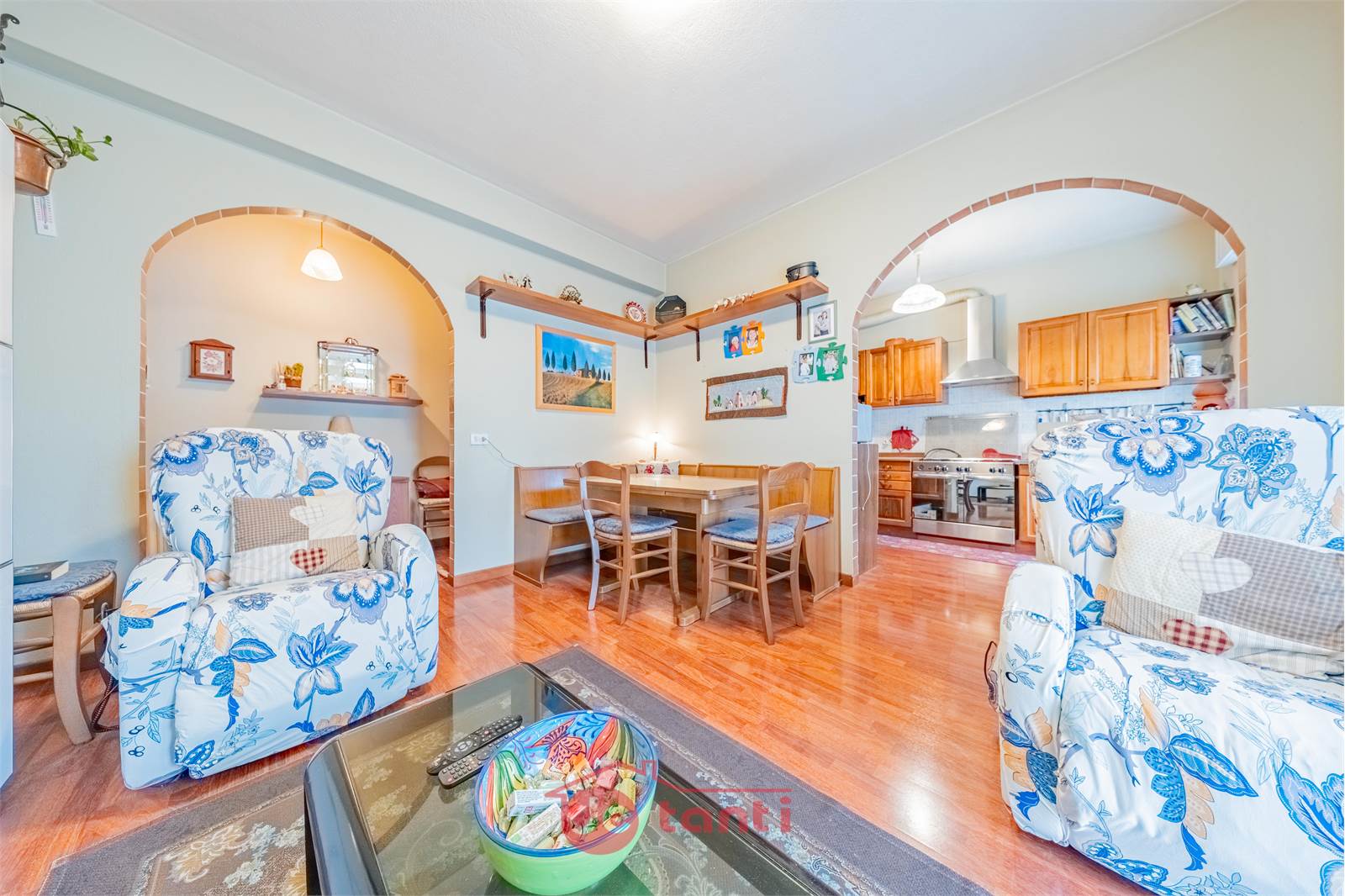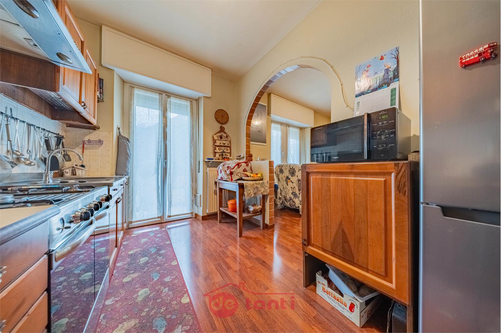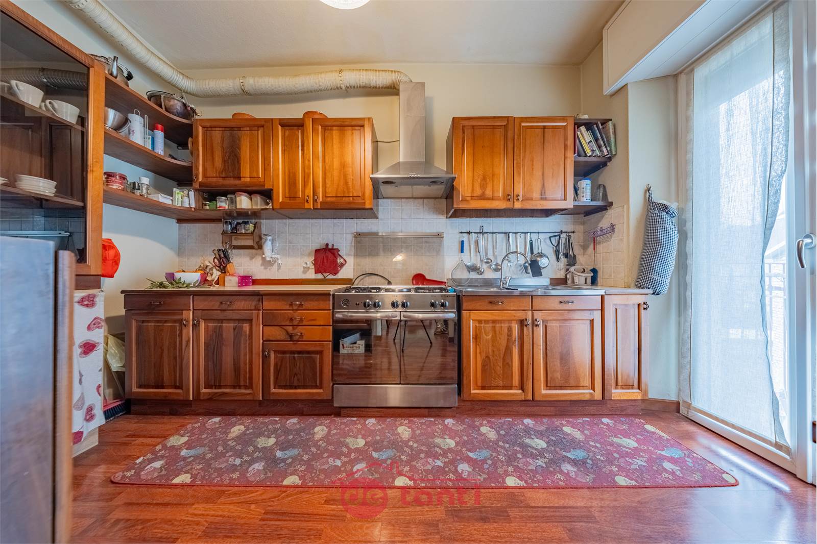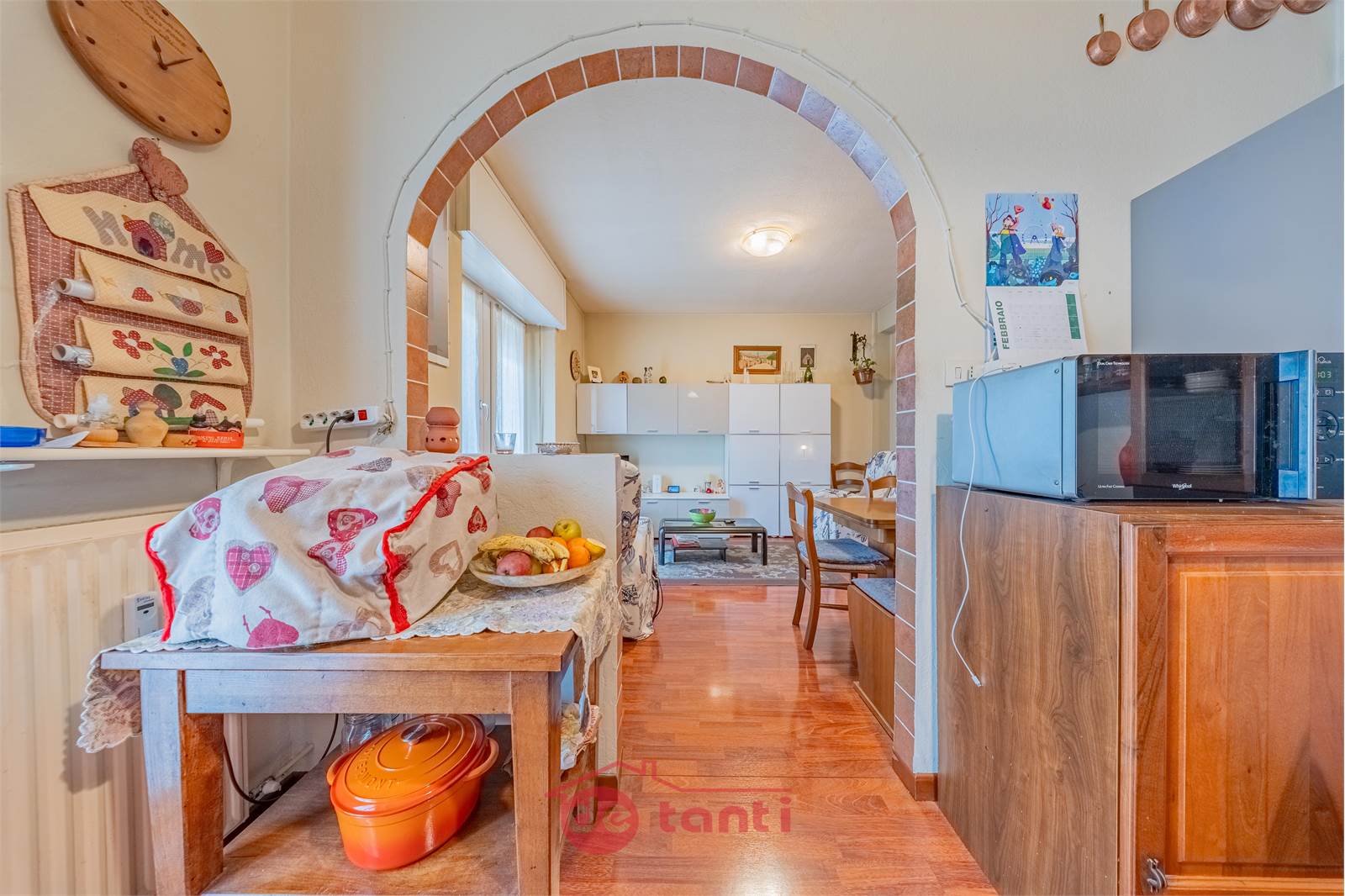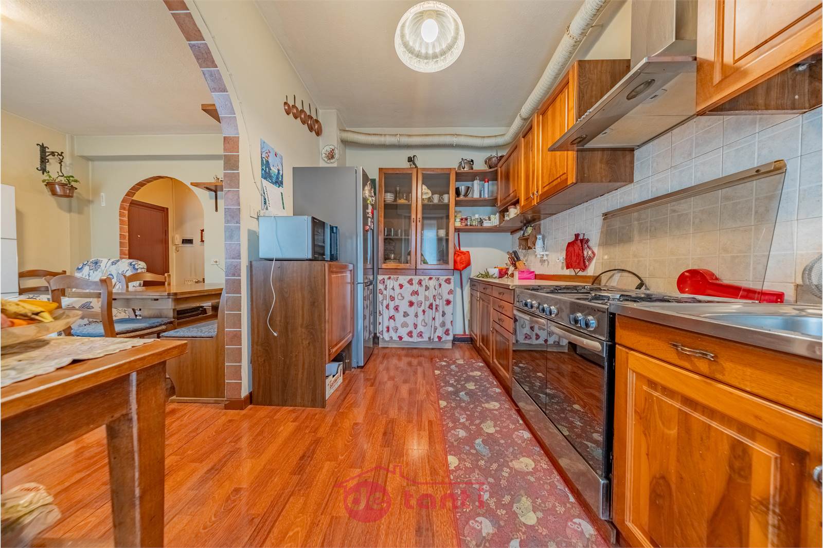 Entrando si percepisce subito una distribuzione razionale degli spazi. Gli ambienti sono distinti, ben proporzionati, pensati per essere vissuti senza adattamenti forzati. Il soggiorno è accogliente e luminoso, collegato alla cucina attraverso un arco che crea continuità visiva mantenendo però la separazione funzionale degli spazi. La cucina è abitabile, completa, con arredi in legno solidi e accesso diretto al balconcino che regala una vista aperta e ariosa: uno spazio pratico nella quotidianità, dove cucinare, organizzare, gestire la casa con ordine.
