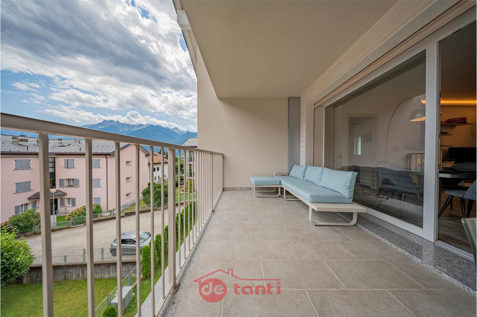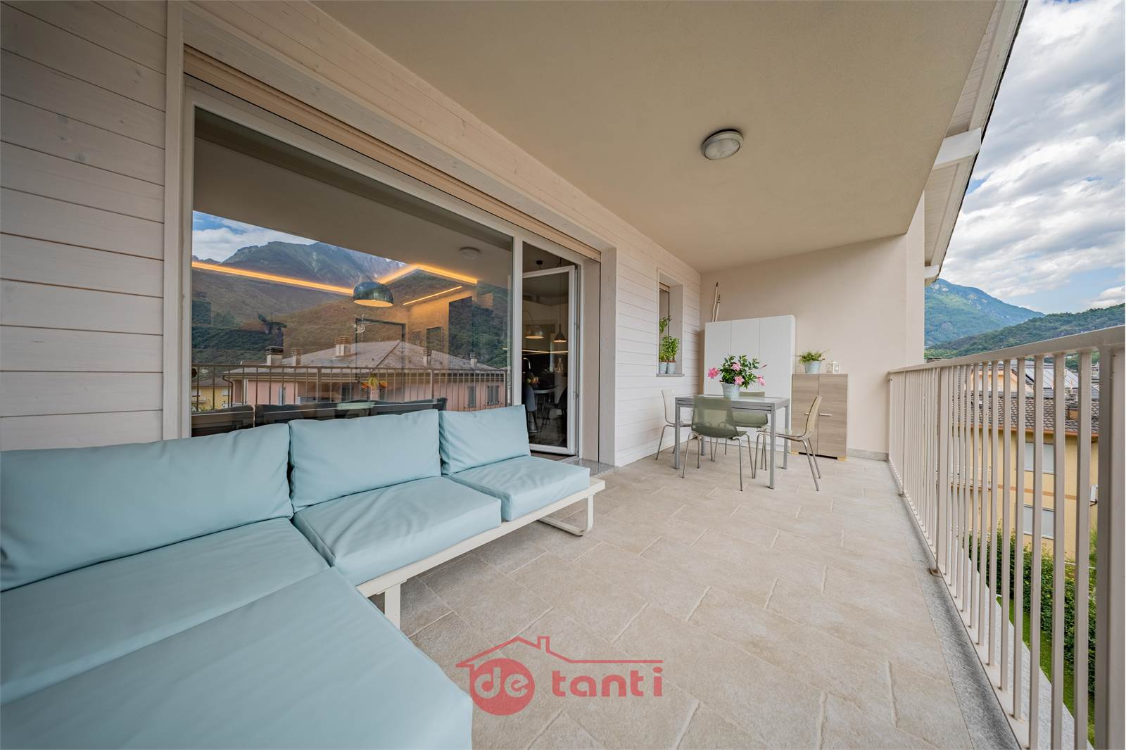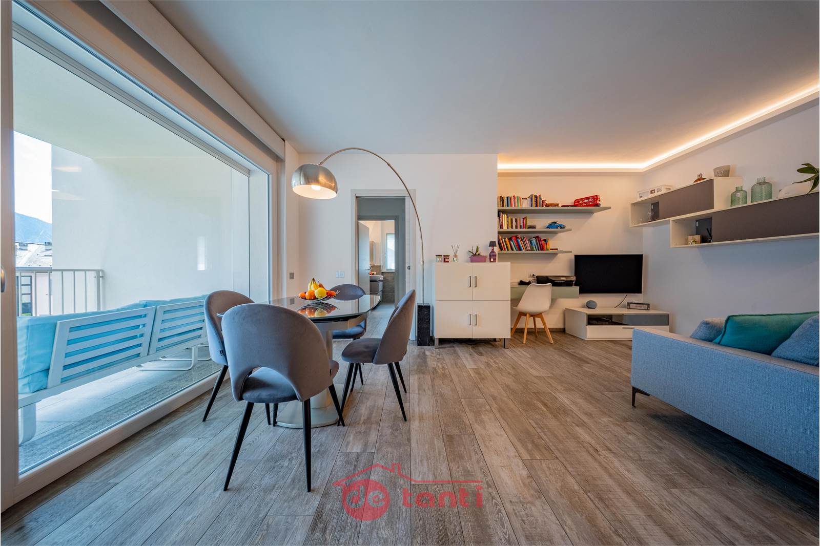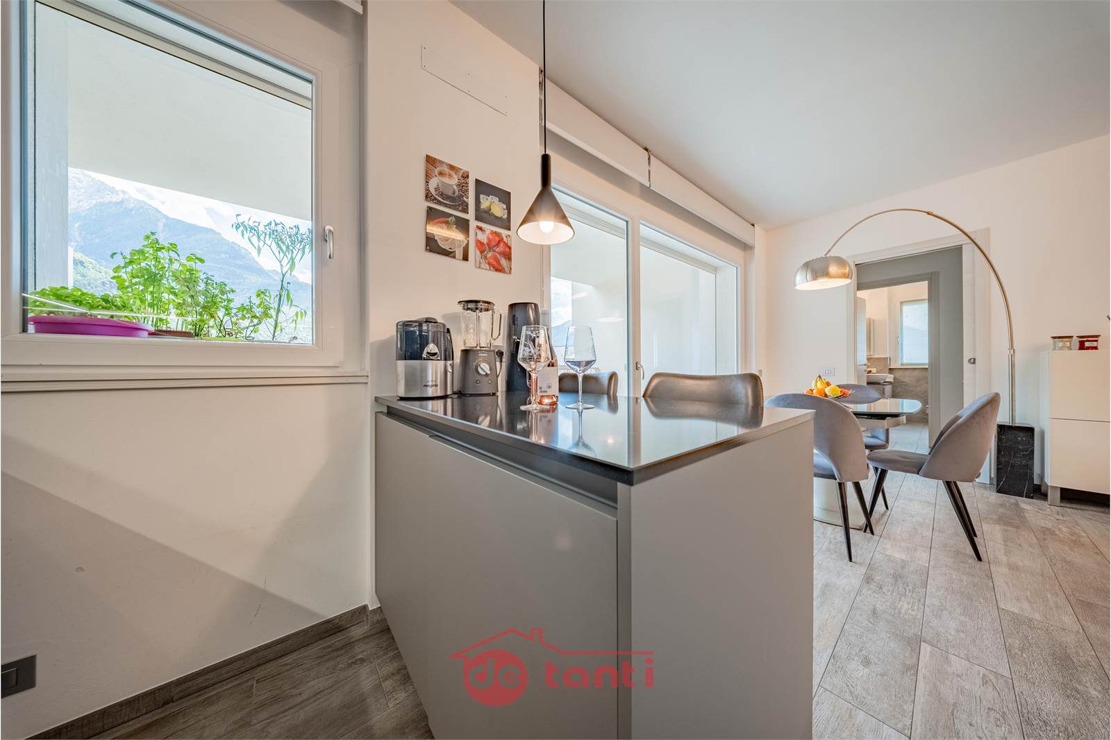 E questo appartamento fa esattamente questo: eleva la quotidianità. Ti svegli al mattino, apri le finestre ed ecco davanti a te il Pizzo di Prata: una cartolina vera, che entra dalla terrazza di 12 mq e si siede con te mentre fai colazione beandoti della vista e del sole che spunta timidamente da dietro le montagne.