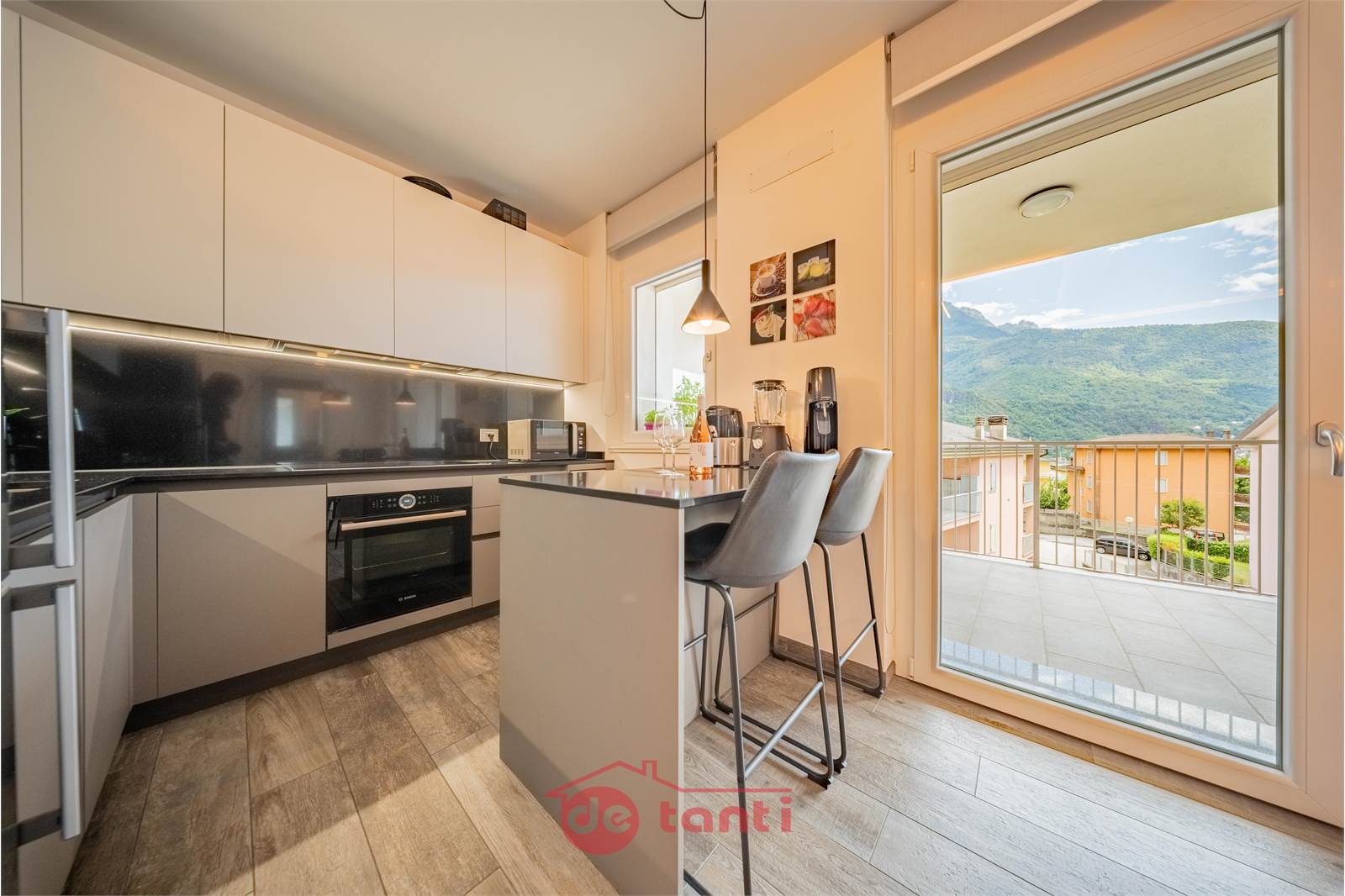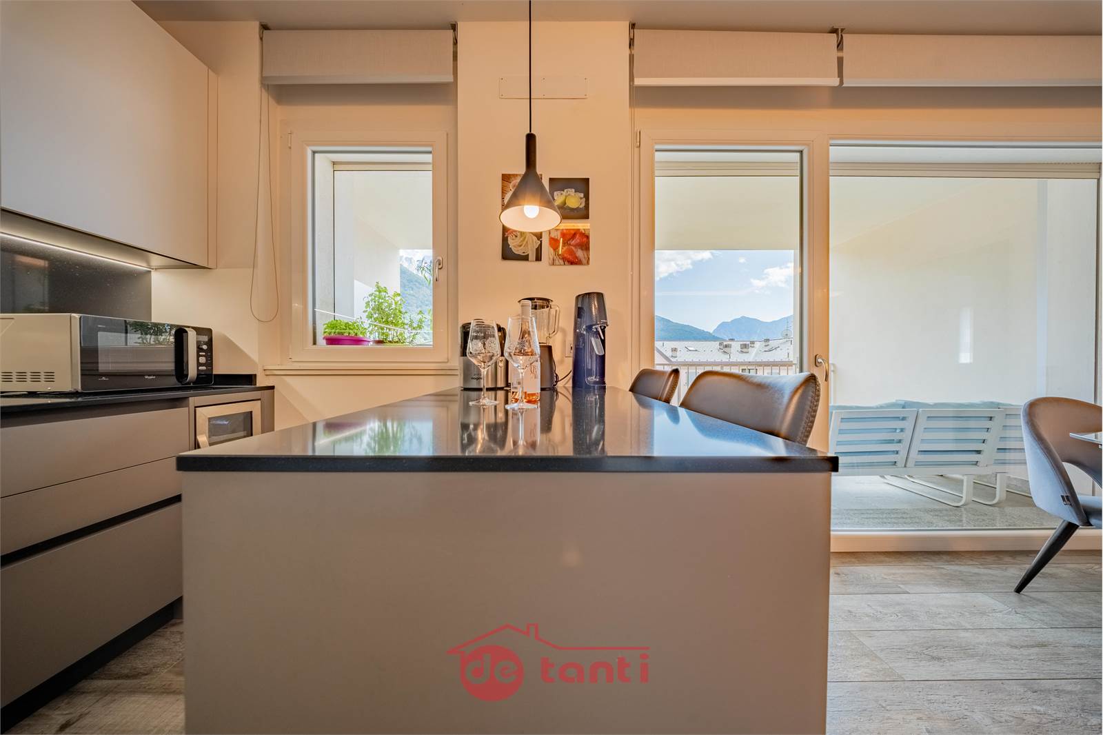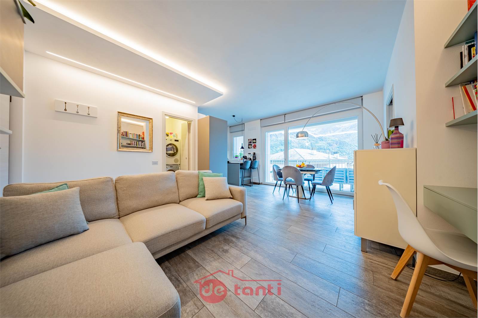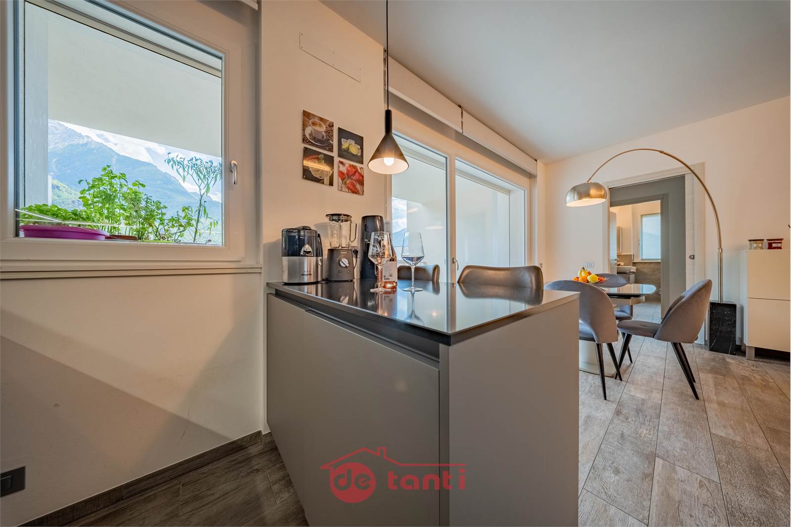 E questo appartamento fa esattamente questo: eleva la quotidianità. Ti svegli al mattino, apri le finestre ed ecco davanti a te il Pizzo di Prata: una cartolina vera, che entra dalla terrazza di 12 mq e si siede con te mentre fai colazione beandoti della vista e del sole che spunta timidamente da dietro le montagne.