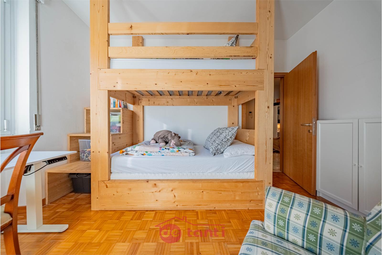 Qui non si è costretti a scendere a compromessi. Il soggiorno è ampio, luminoso e arioso, uno di quegli spazi che risolvono davvero la quotidianità: cene in famiglia, momenti di relax, bambini che giocano senza dover continuamente fare attenzione agli spazi. L’esposizione e le superfici finestrate garantiscono luce naturale per gran parte della giornata, rendendo l’ambiente accogliente e facile da vivere, oggi e nel tempo.