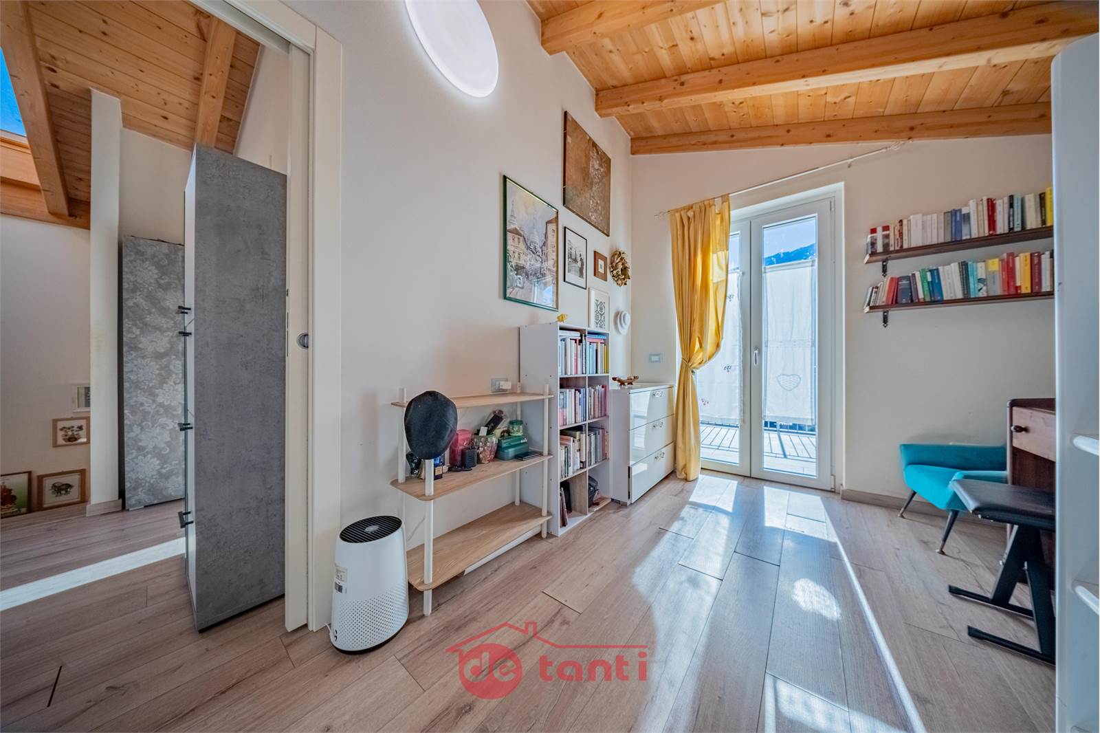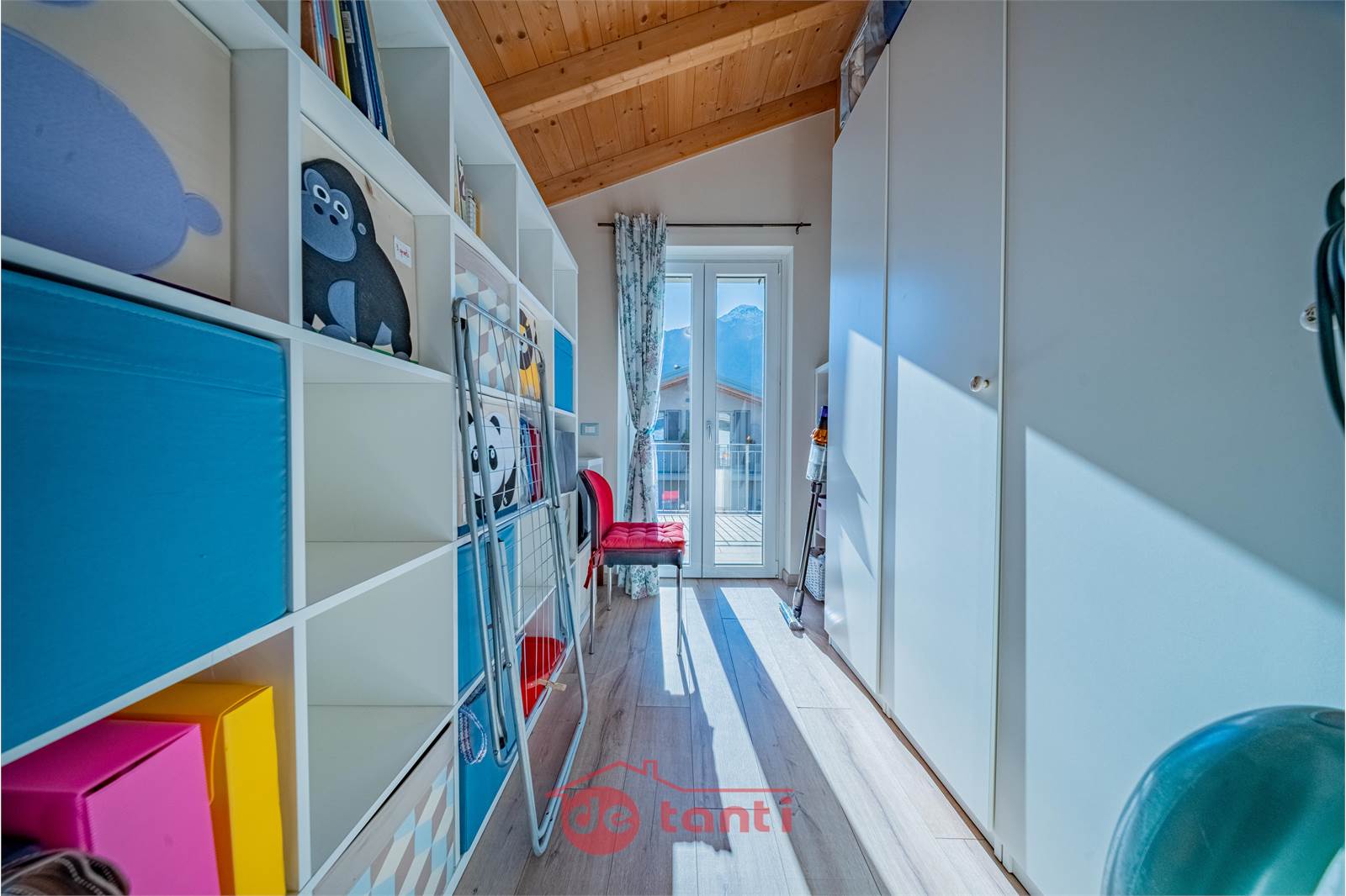 Salendo al piano superiore, il legno del soffitto e la luce che entra dalle finestre creano un’atmosfera calda e familiare. Le due camere principali accolgono il riposo e si aprono entrambe verso l’esterno, su terrazzi privati dove rilassarsi guardando il profilo delle montagne. Una terza stanza, più intima, può diventare uno studio, una cameretta o semplicemente uno spazio in più da vivere come si desidera. Il bagno, moderno e luminoso, completa la zona notte con discrezione e comfort.