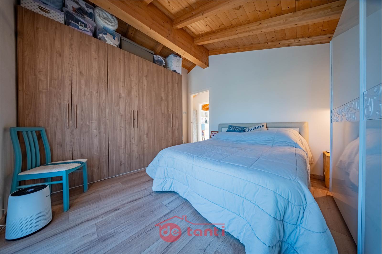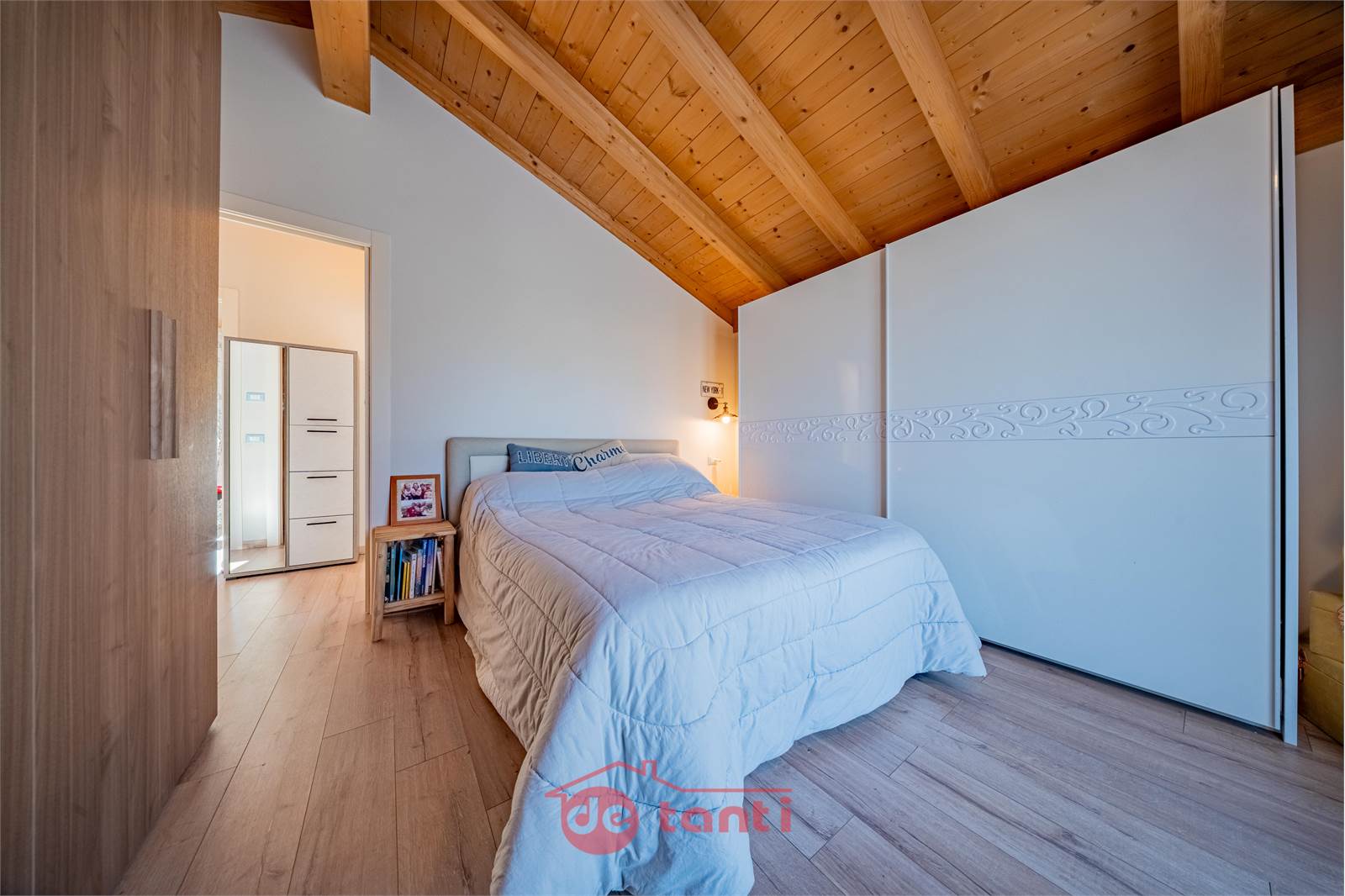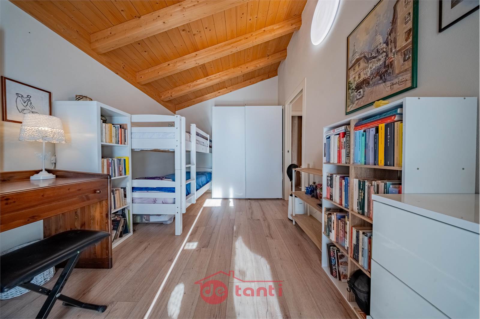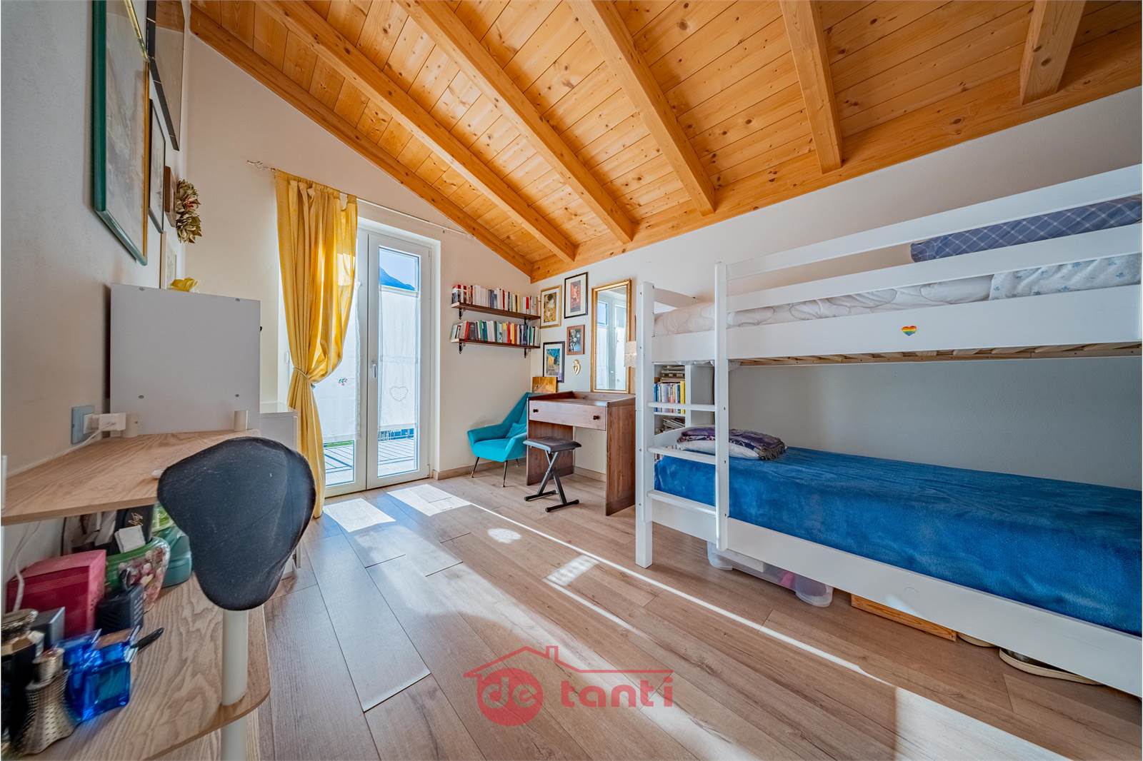 La zona notte, con le sue due camere più ripostiglio, conserva la parte più intima e rassicurante dell’abitazione. La camera con il soffitto in legno a vista regala un colpo d’occhio caldo, curato e distintivo, capace di rendere l’ambiente raccolto ma allo stesso tempo elegante. È uno di quei dettagli che non servono solo a colpire, ma che alzano concretamente la qualità del vivere quotidiano, rendendo la casa più riconoscibile, più personale, più completa. Le stanze offrono la flessibilità che una famiglia cerca davvero: spazi per crescere, per lavorare, per riposare, per cambiare senza dover ricominciare da capo.