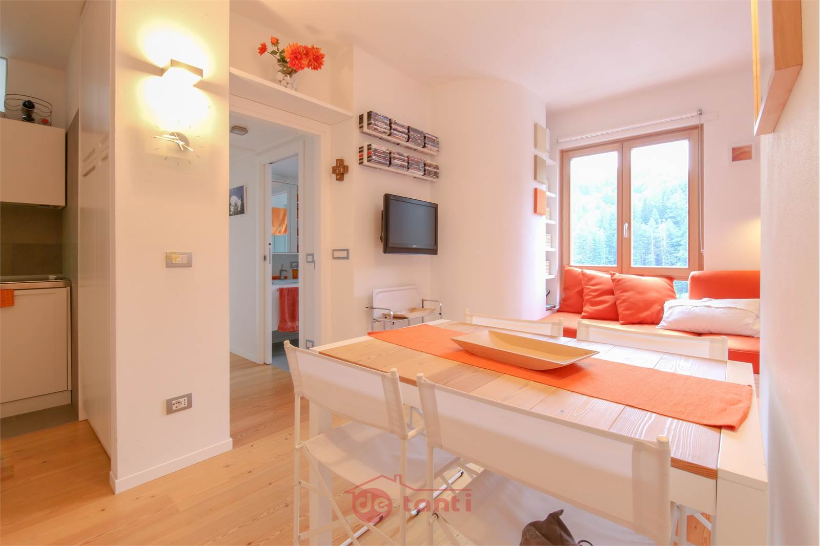 A Madesimo, nel cuore del paese e proprio di fronte alle piste, c’è un trilocale che non si limita a offrire un appoggio per le vacanze: semplifica la vita di chi arriva qui con la famiglia e cerca un rifugio comodo, accogliente e pratico. Salendo al settimo piano, la vista si apre luminosa e distesa, e la sensazione è subito quella di un luogo che protegge le routine e rende ogni momento più immediato. Il soggiorno esposto a sud avvolge con il suo calore e con arredi su misura che tengono tutto in ordine, mentre la cucina, compatta e completa, consente di preparare i pasti con facilità, senza sacrificare nulla in termini di funzionalità.