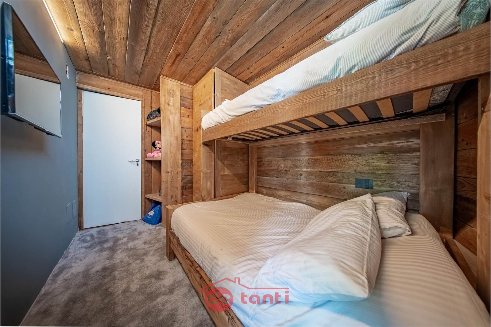 Due camere da letto, spazio ed eleganza proprio per tutti; una matrimoniale dove svegliarti completamente ricaricato, con la luce del mattino che rimbalza sul legno grezzo, e una cameretta con letti a castello, perfetta per i bambini o per gli ospiti. Due bagni dal gusto contemporaneo, rifiniti in pietra e legno, che sanno di spa privata, di lusso e di docce rigeneranti.