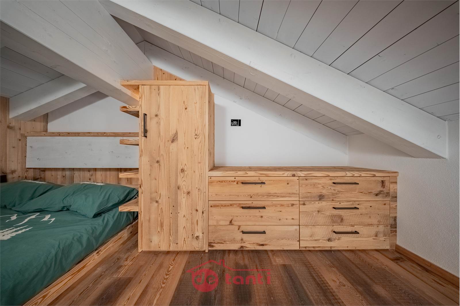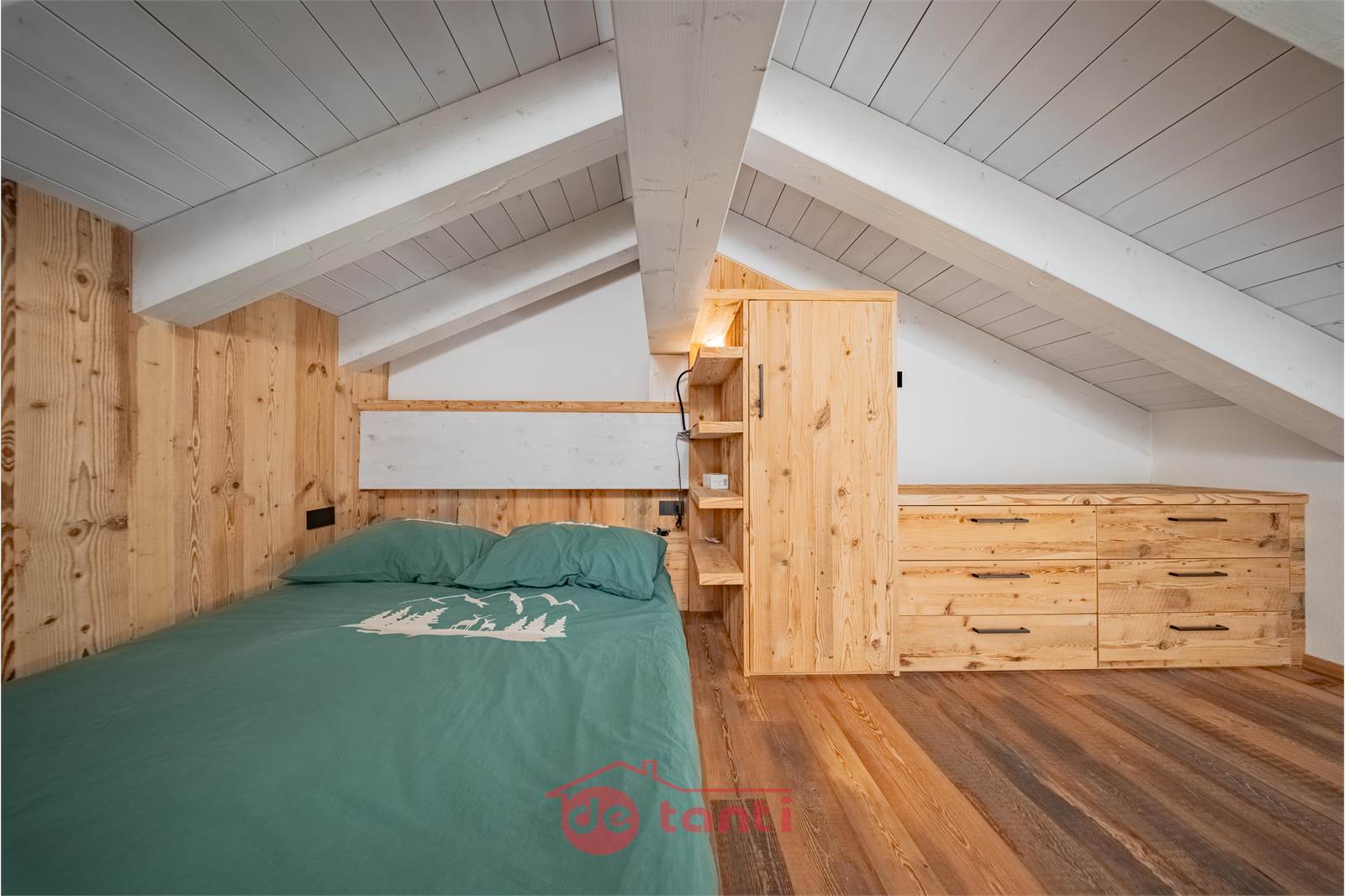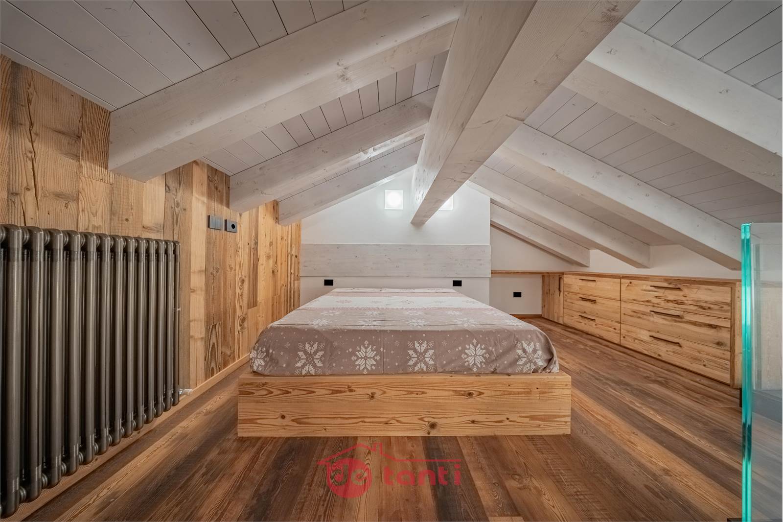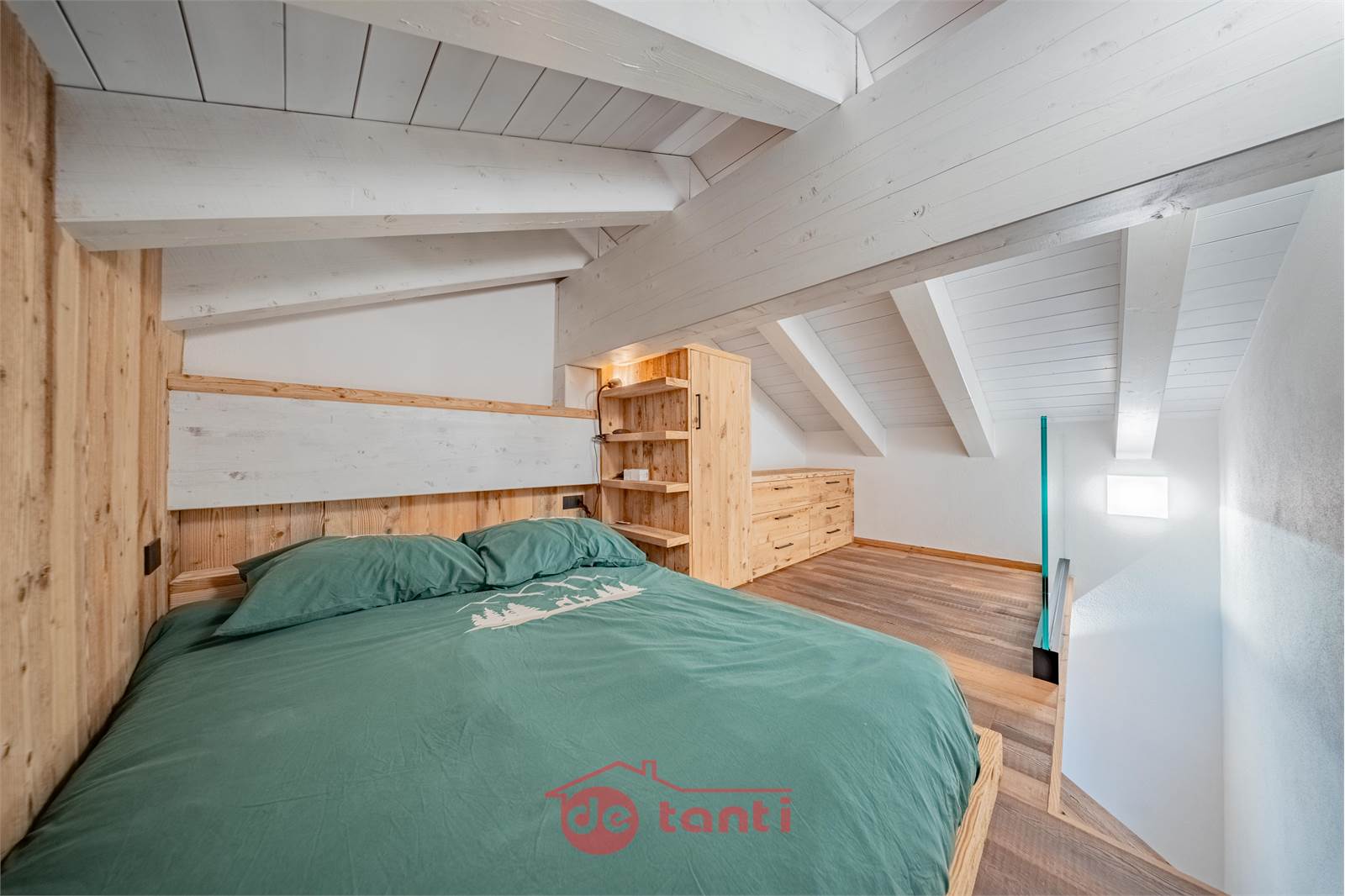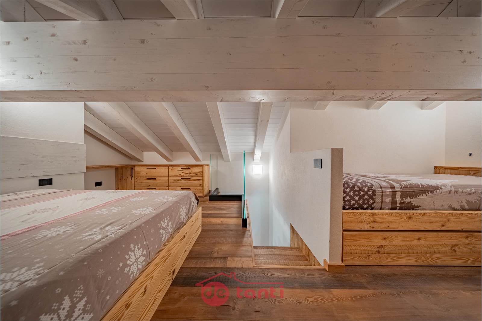 La zona notte comprende una camera matrimoniale accogliente con armadiature razionali e una camera sottotetto raggiungibile dalla scala della seconda zona giorno, suggestiva sotto le travi bianche, perfetta come nido silenzioso per il riposo.