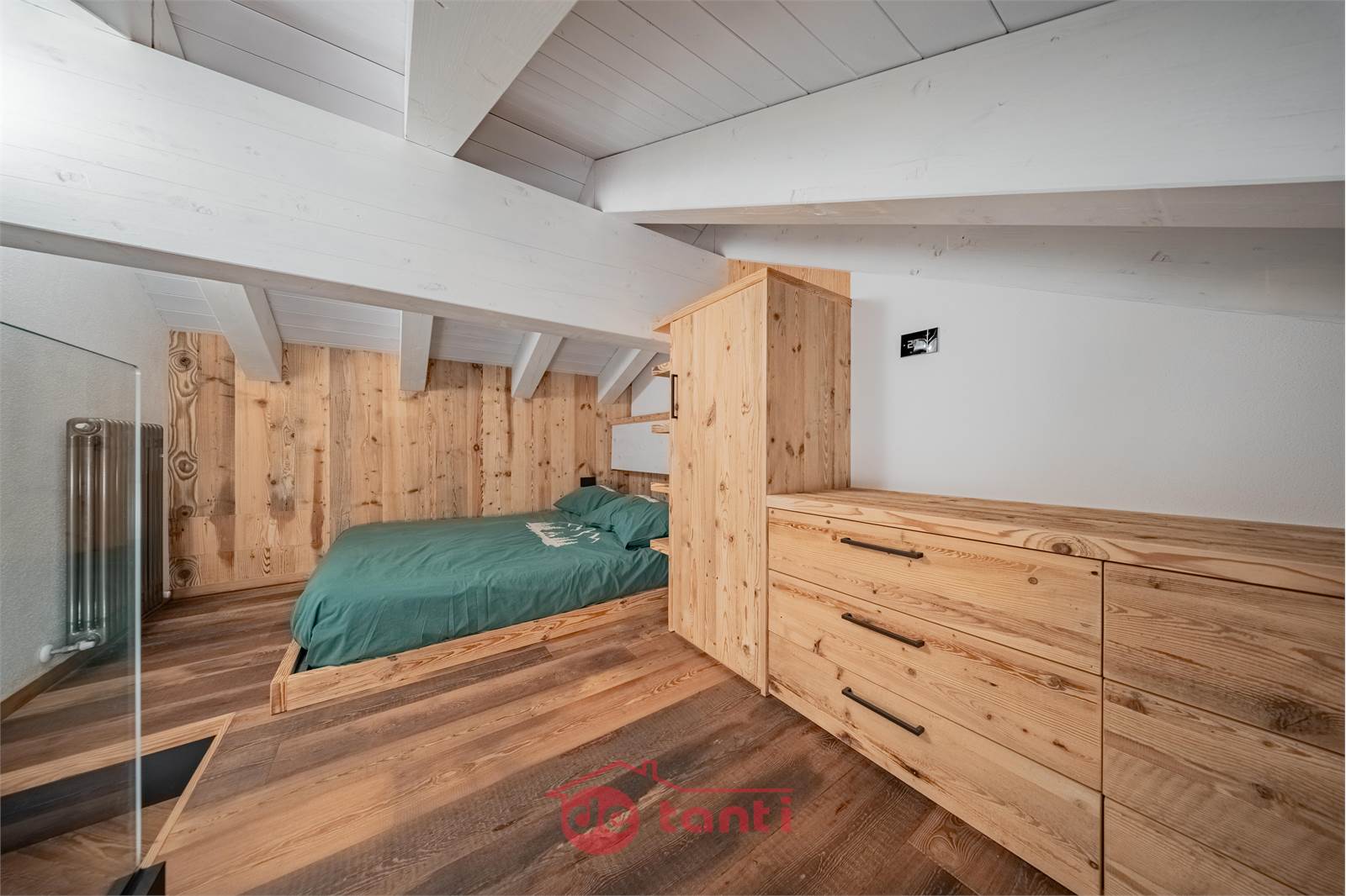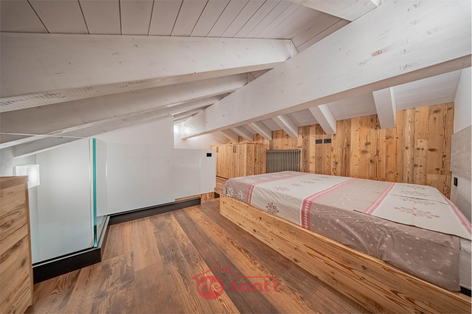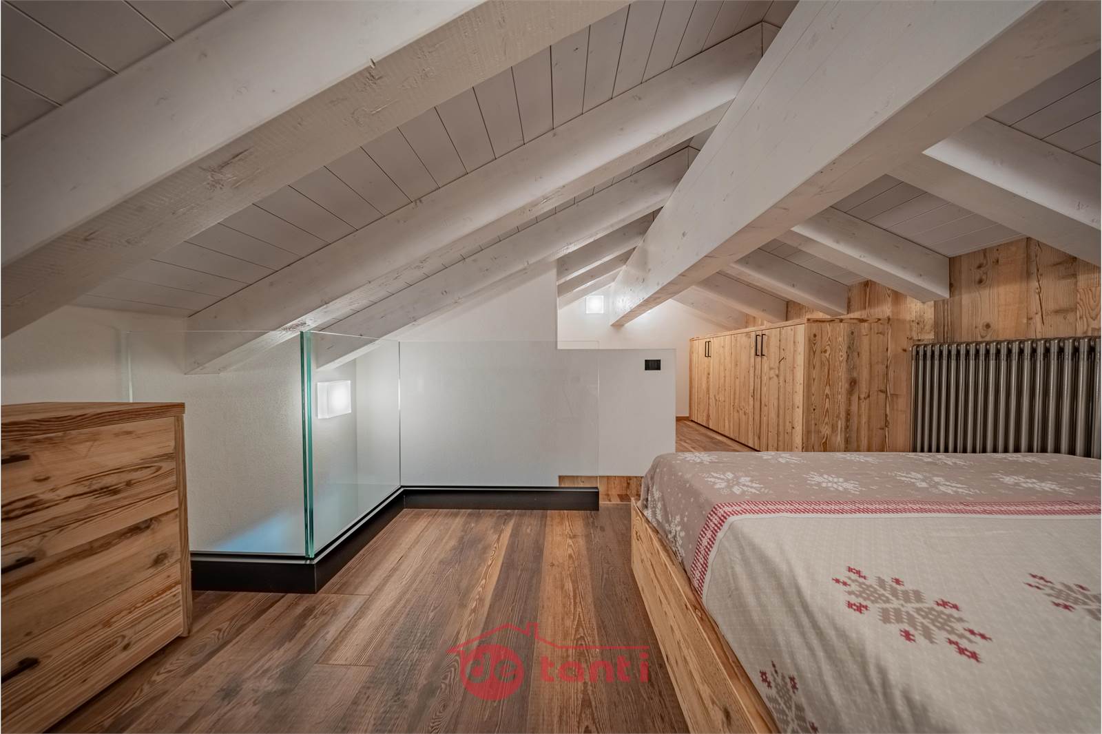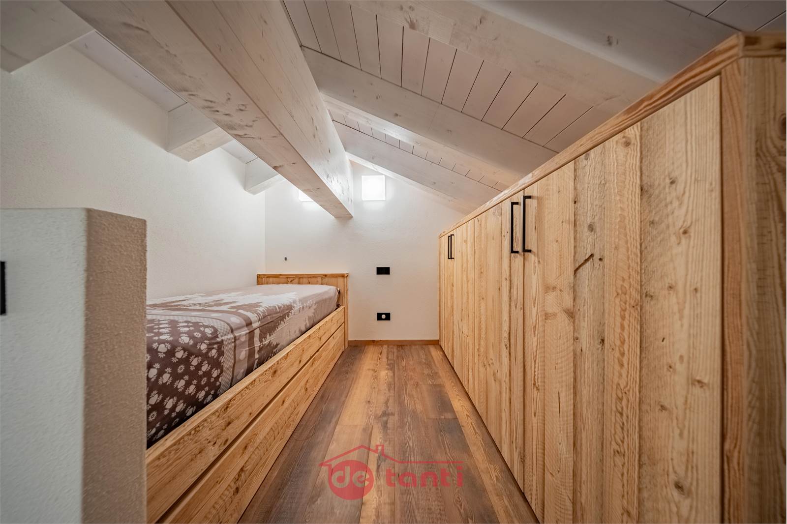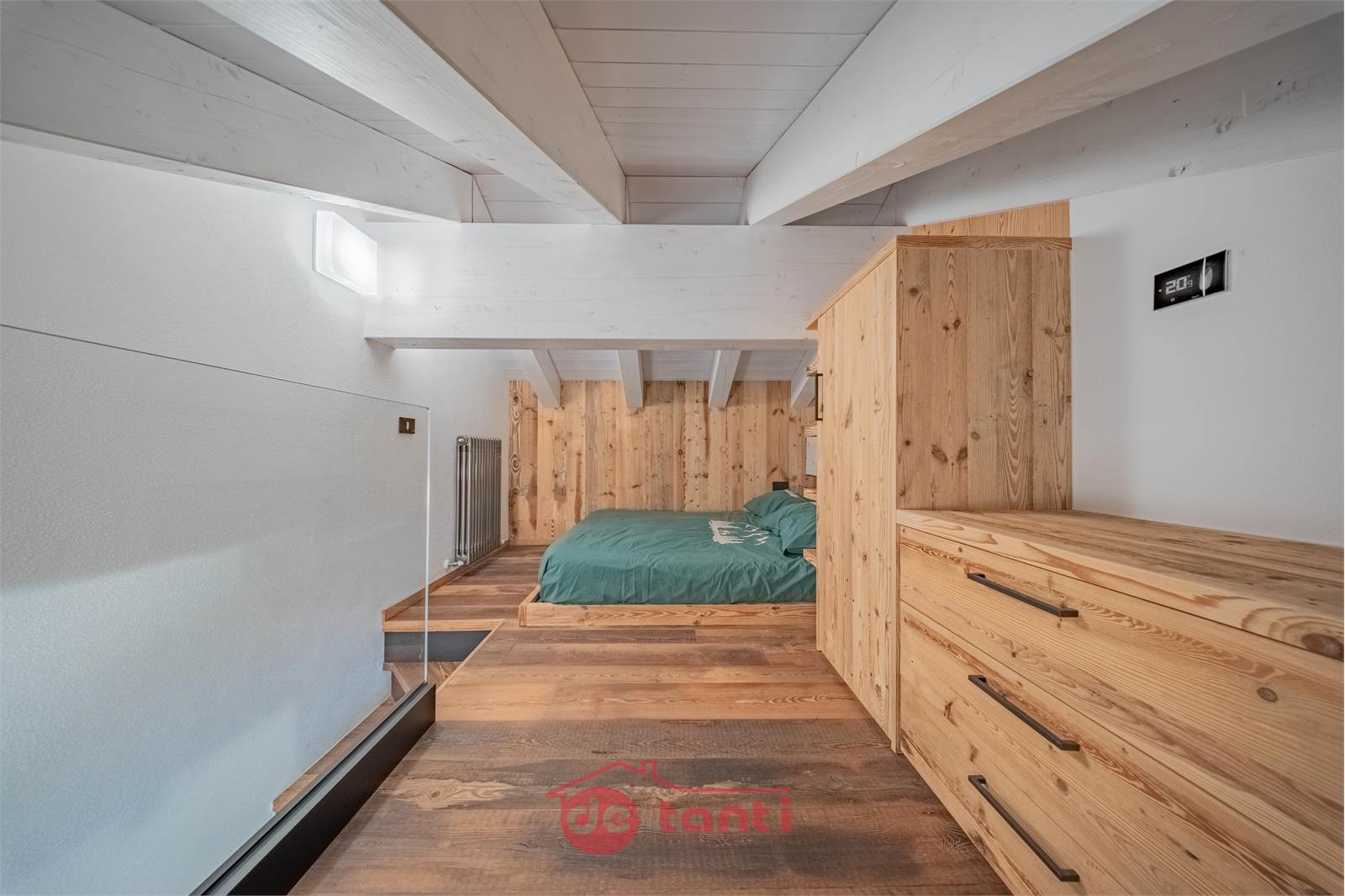 La zona notte comprende una camera matrimoniale accogliente con armadiature razionali e una camera sottotetto raggiungibile dalla scala della seconda zona giorno, suggestiva sotto le travi bianche, perfetta come nido silenzioso per il riposo.