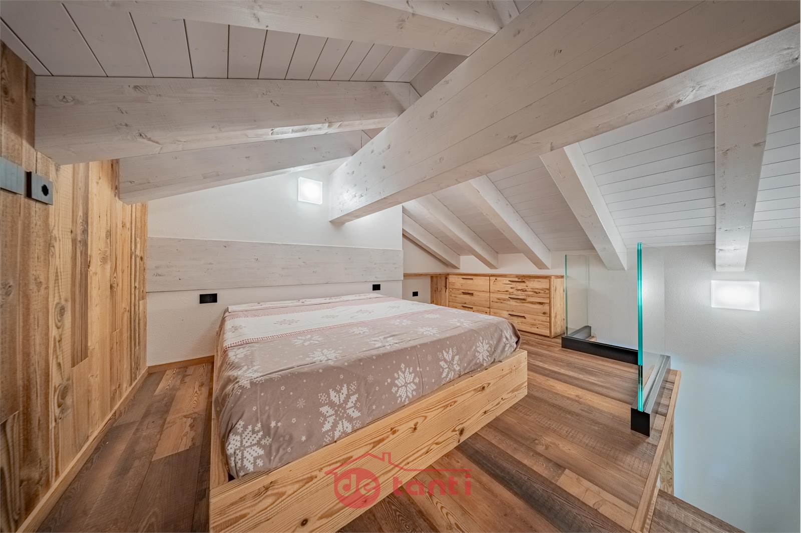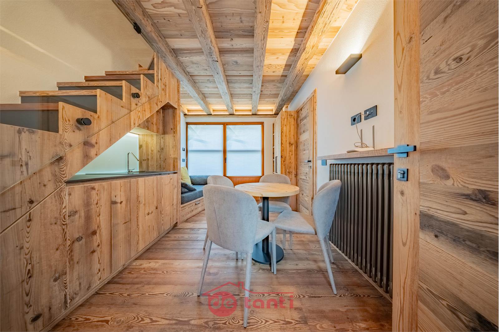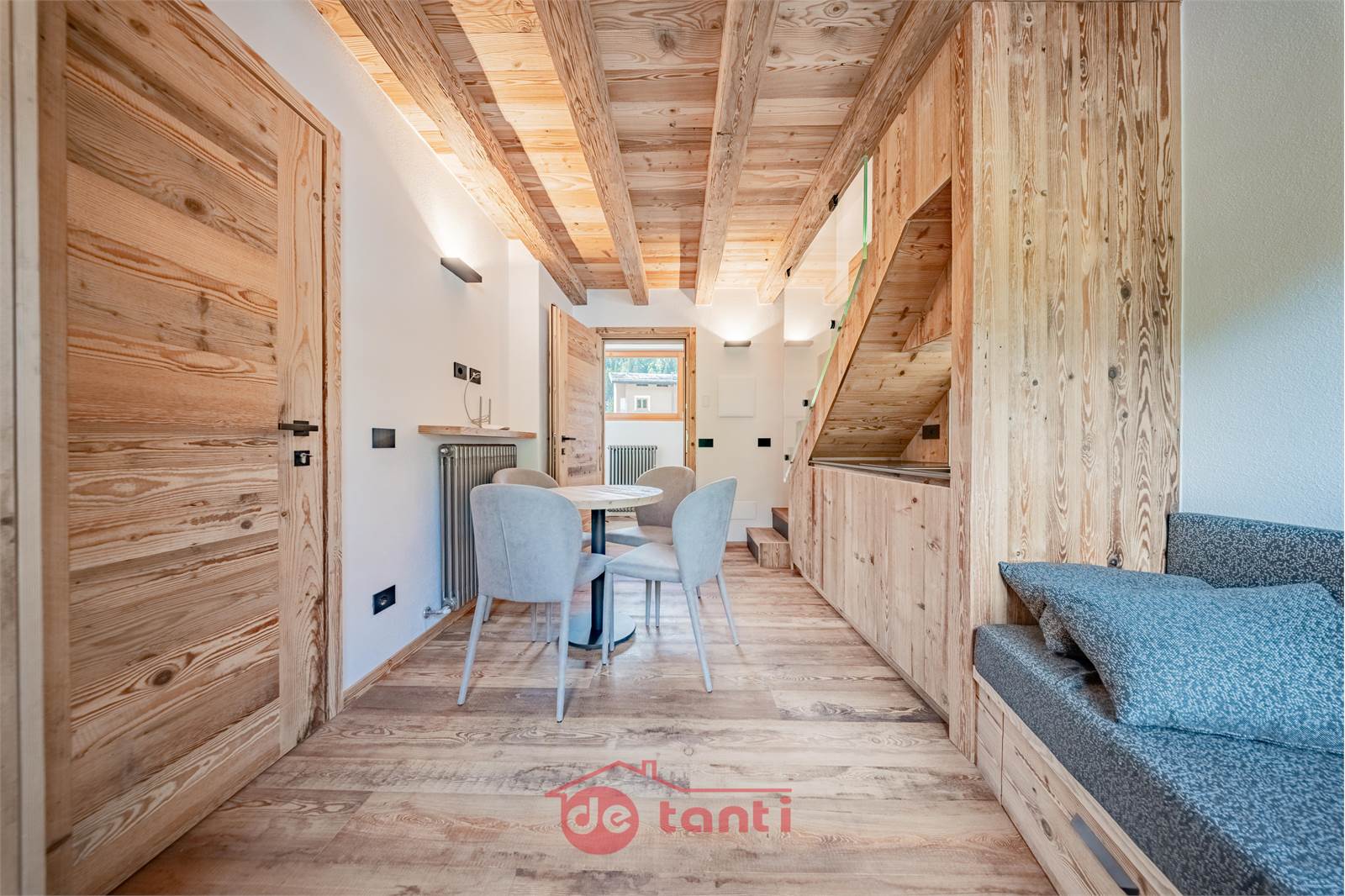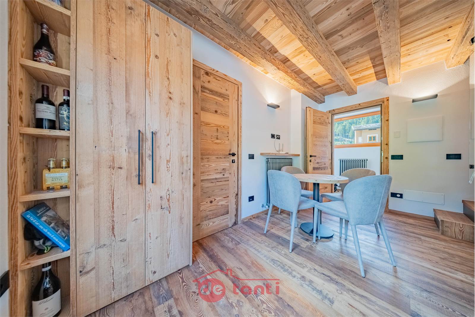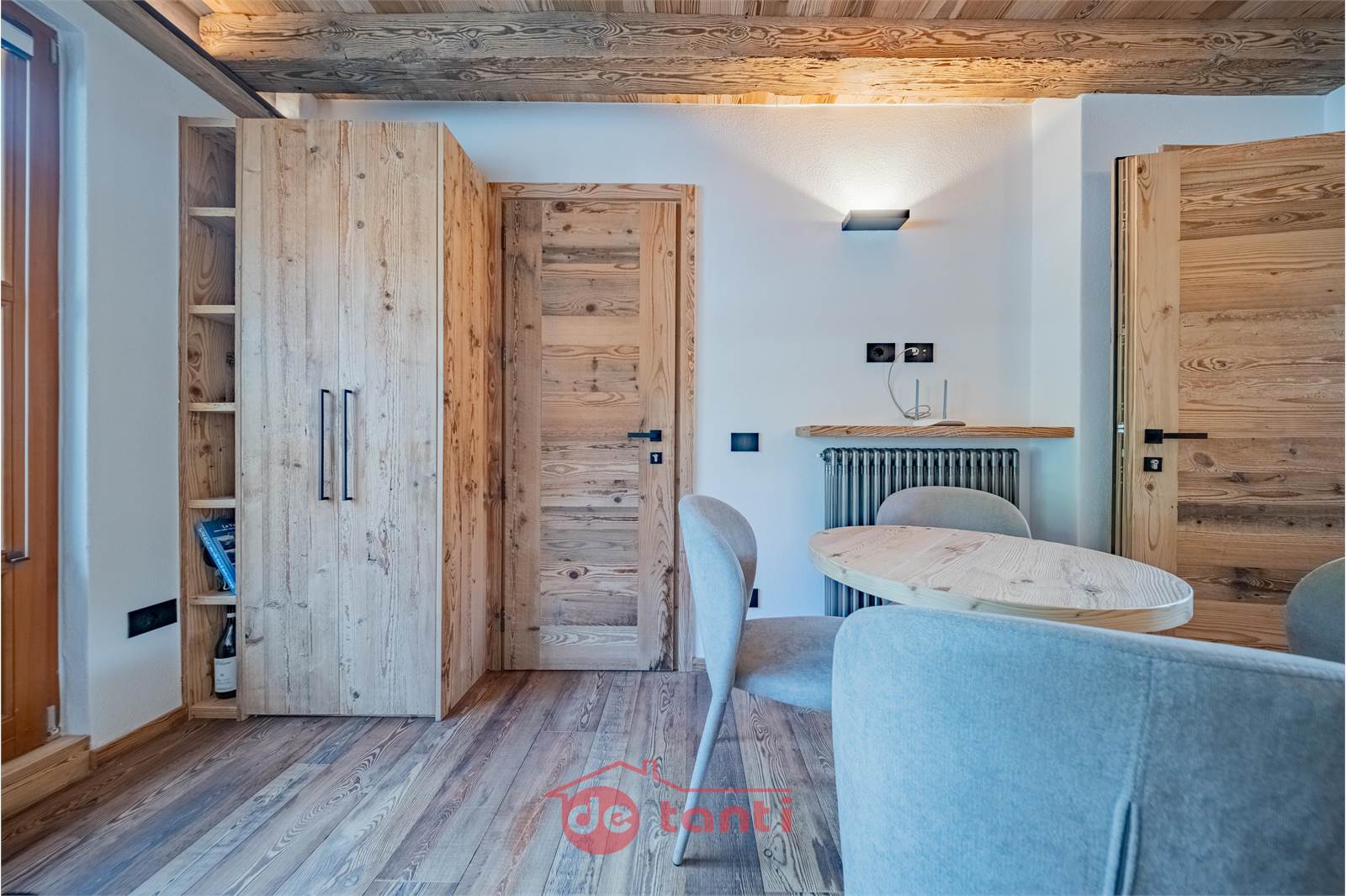 Il progetto di ristrutturazione ha messo al centro luce e legno: travi a vista, boiserie e pavimenti in tavole larghe disegnano un’atmosfera alpina contemporanea; l’illuminazione a LED integrata scalda i volumi e valorizza i dettagli artigianali.