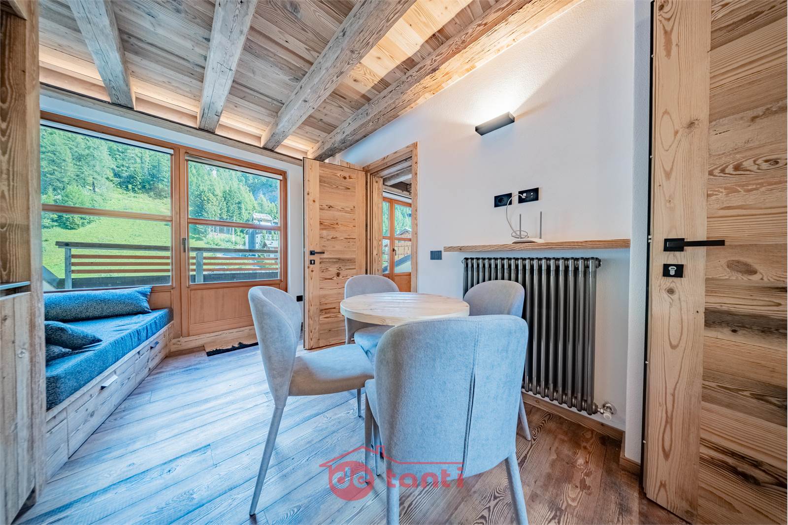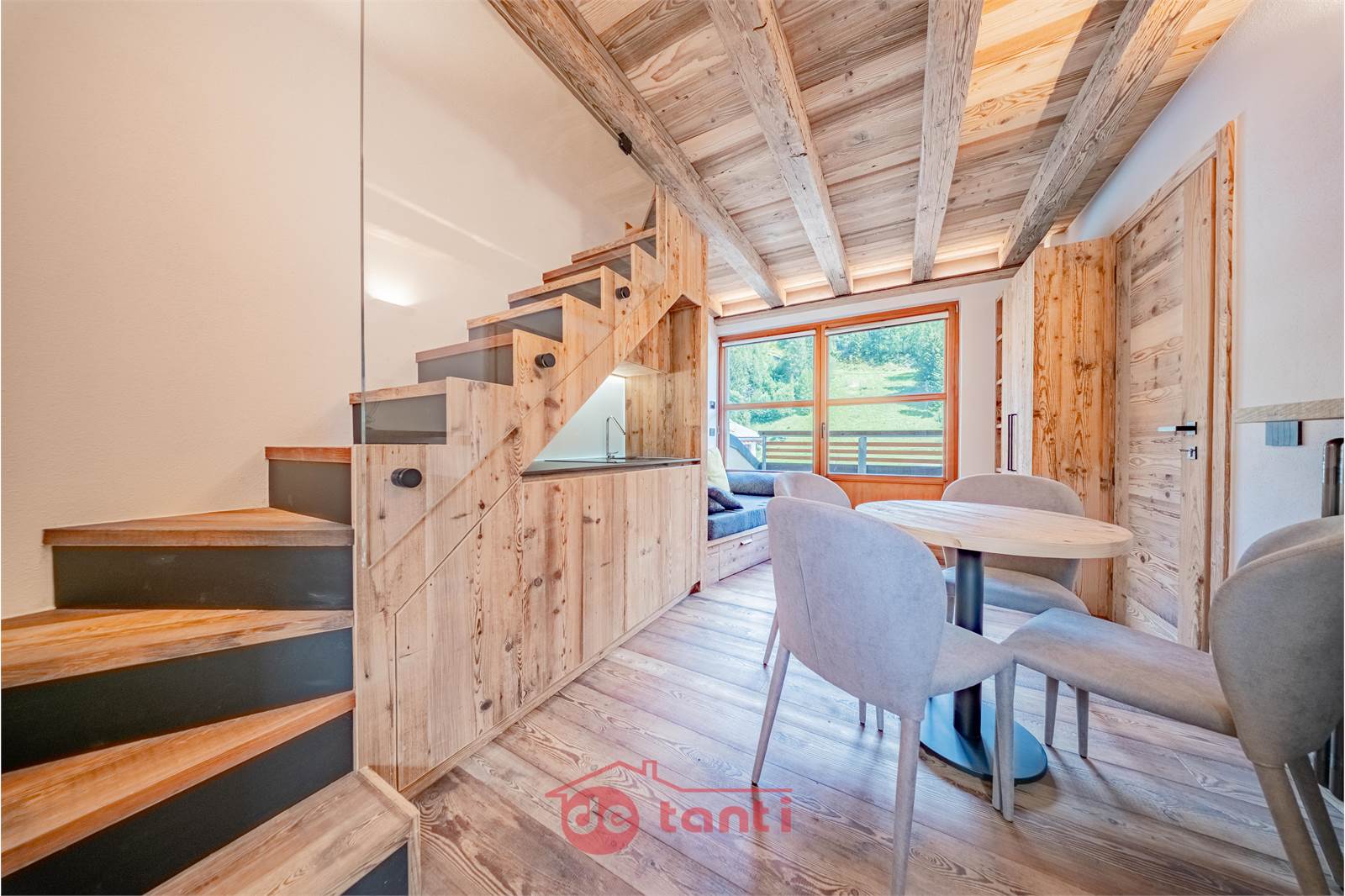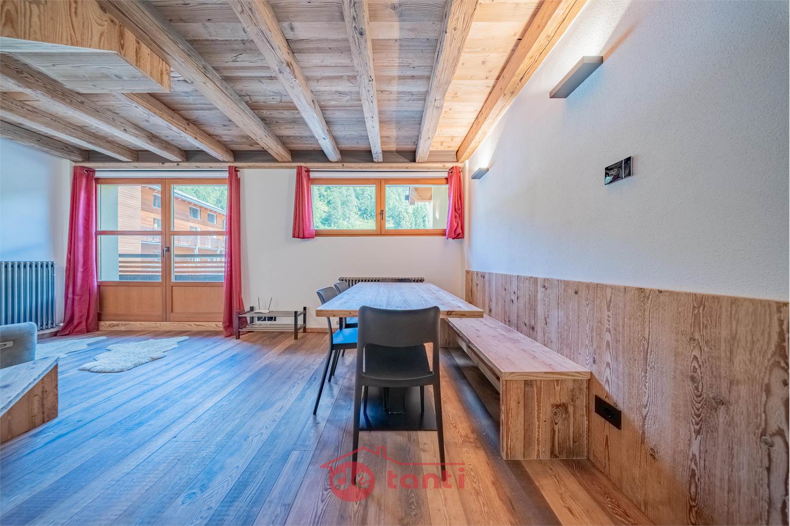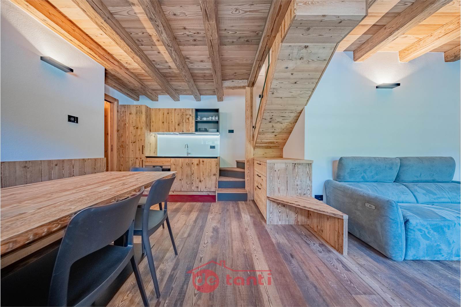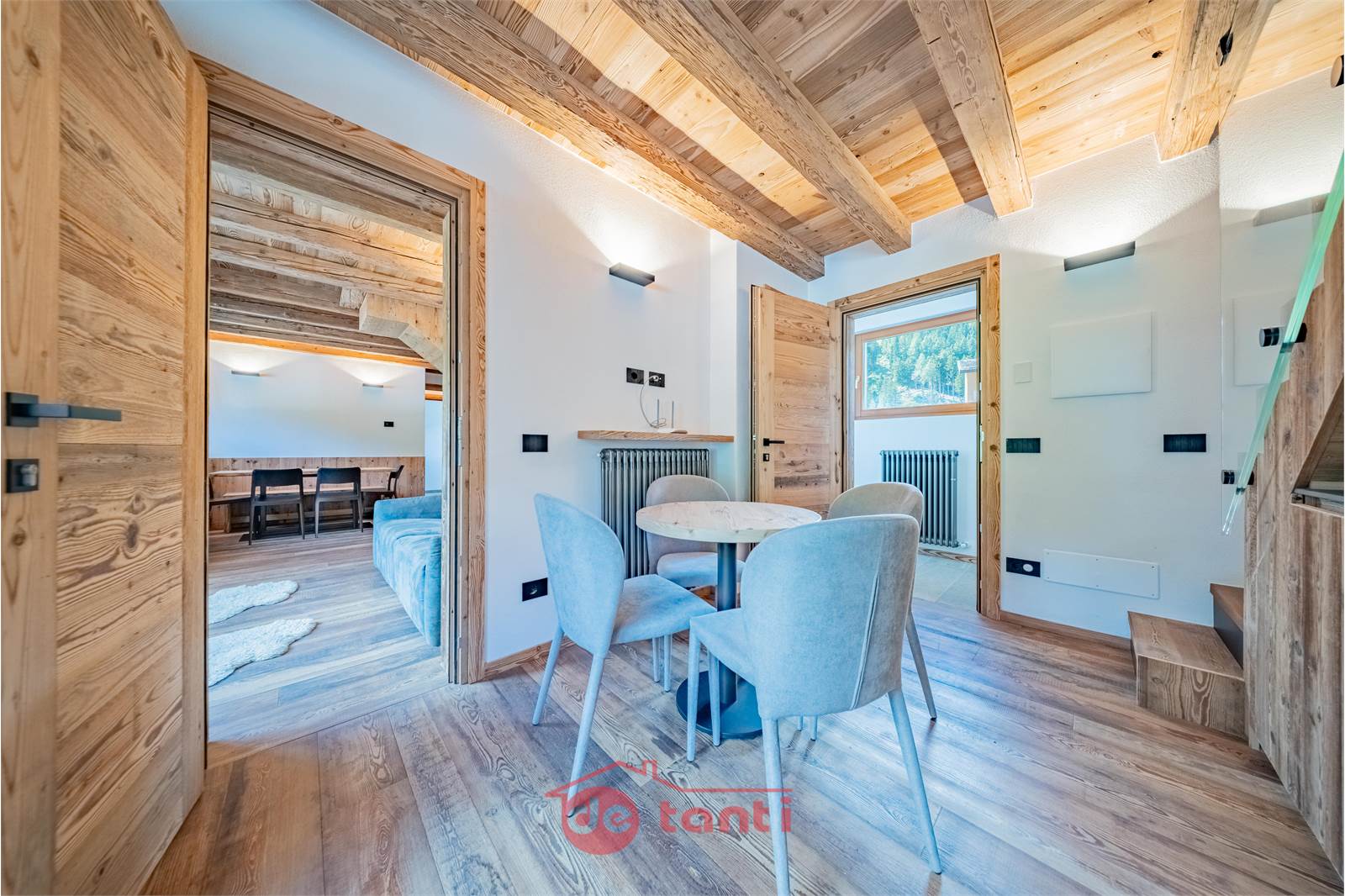 Il progetto di ristrutturazione ha messo al centro luce e legno: travi a vista, boiserie e pavimenti in tavole larghe disegnano un’atmosfera alpina contemporanea; l’illuminazione a LED integrata scalda i volumi e valorizza i dettagli artigianali.