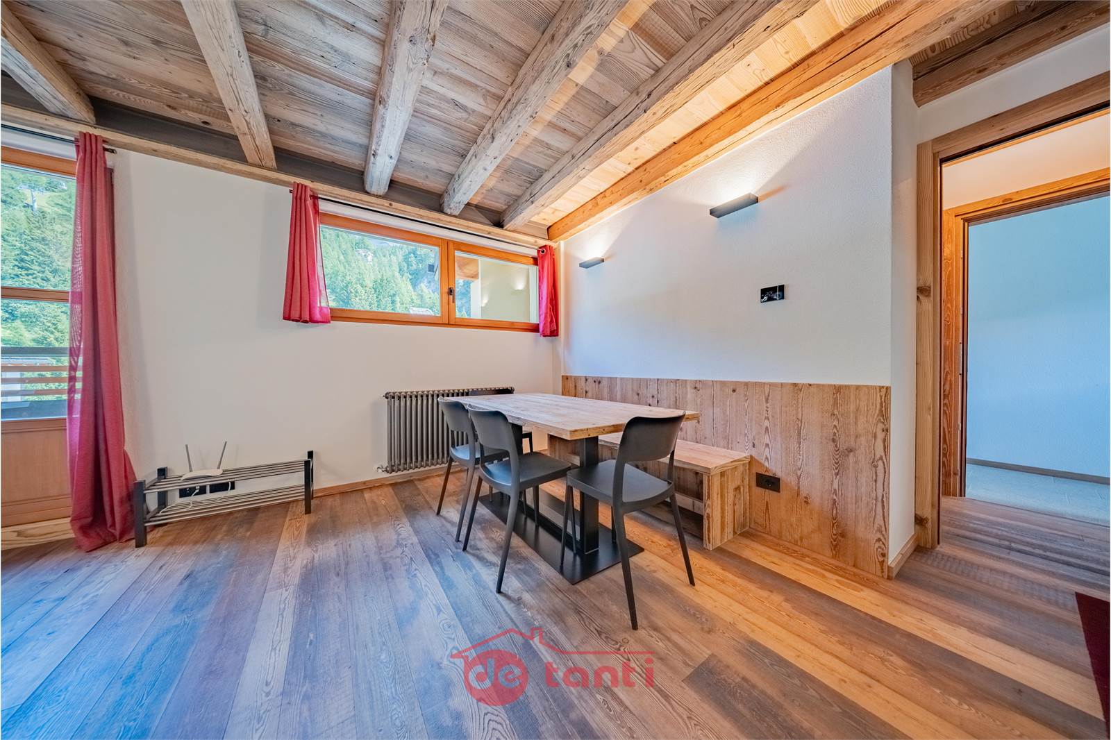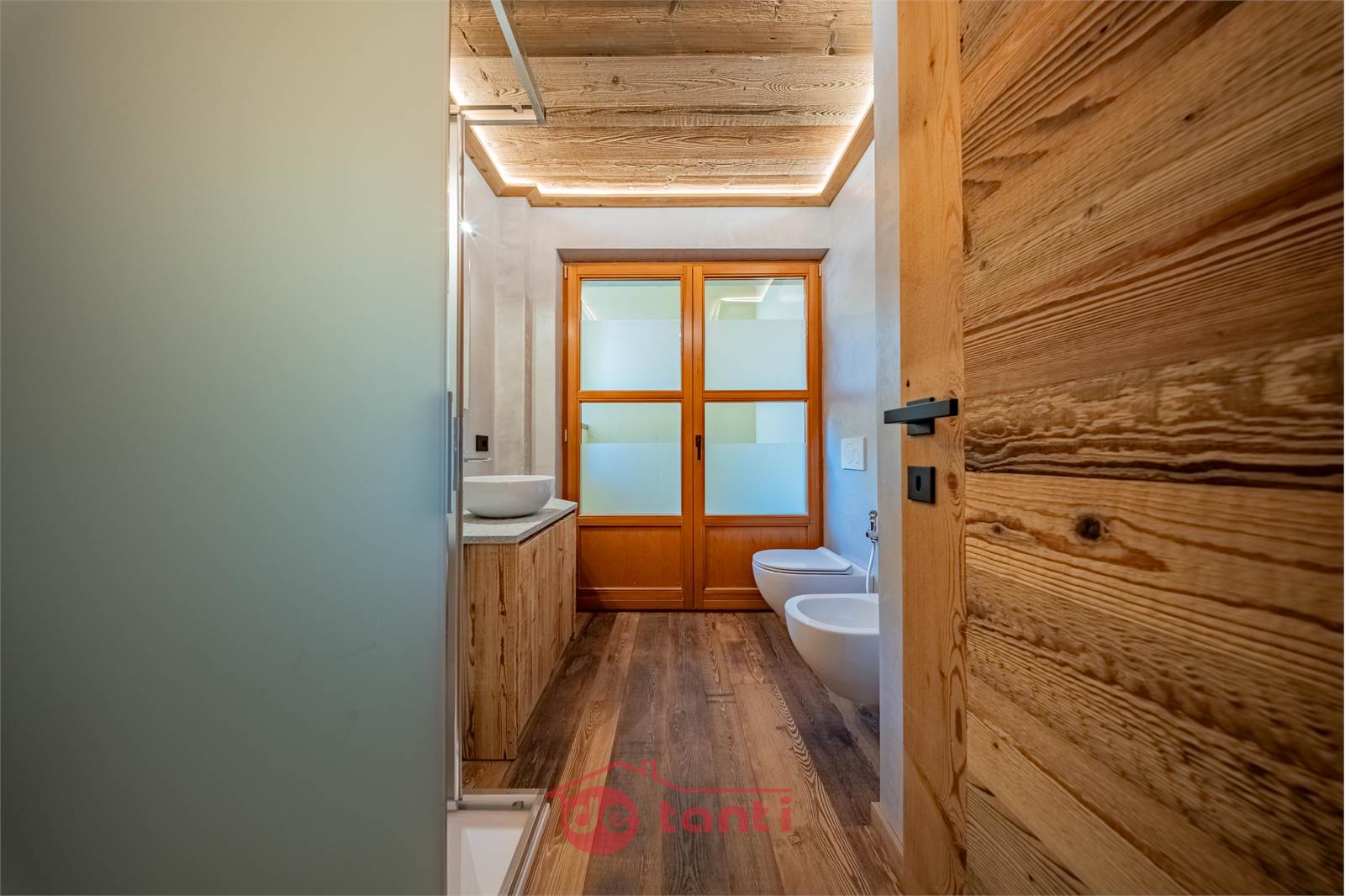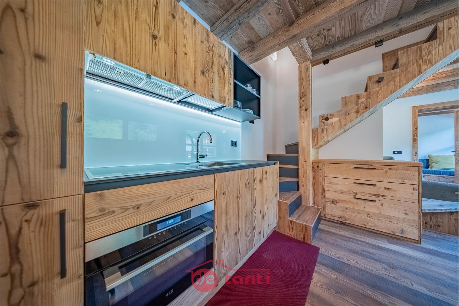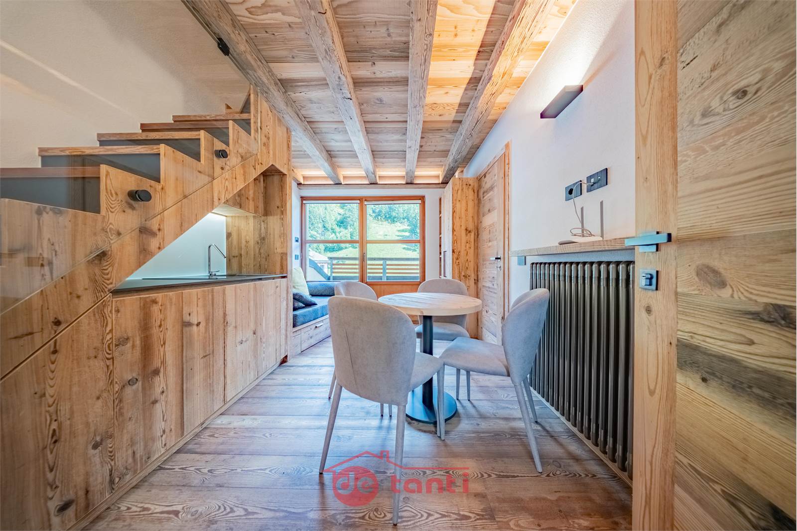 Il progetto di ristrutturazione ha messo al centro luce e legno: travi a vista, boiserie e pavimenti in tavole larghe disegnano un’atmosfera alpina contemporanea; l’illuminazione a LED integrata scalda i volumi e valorizza i dettagli artigianali.