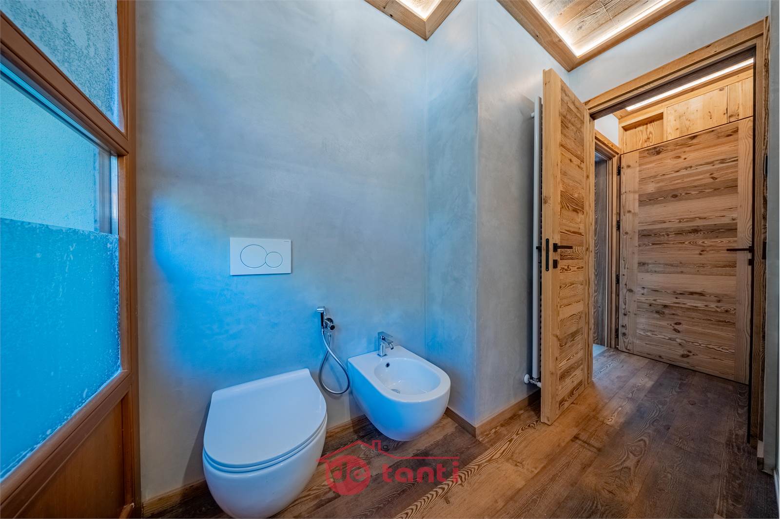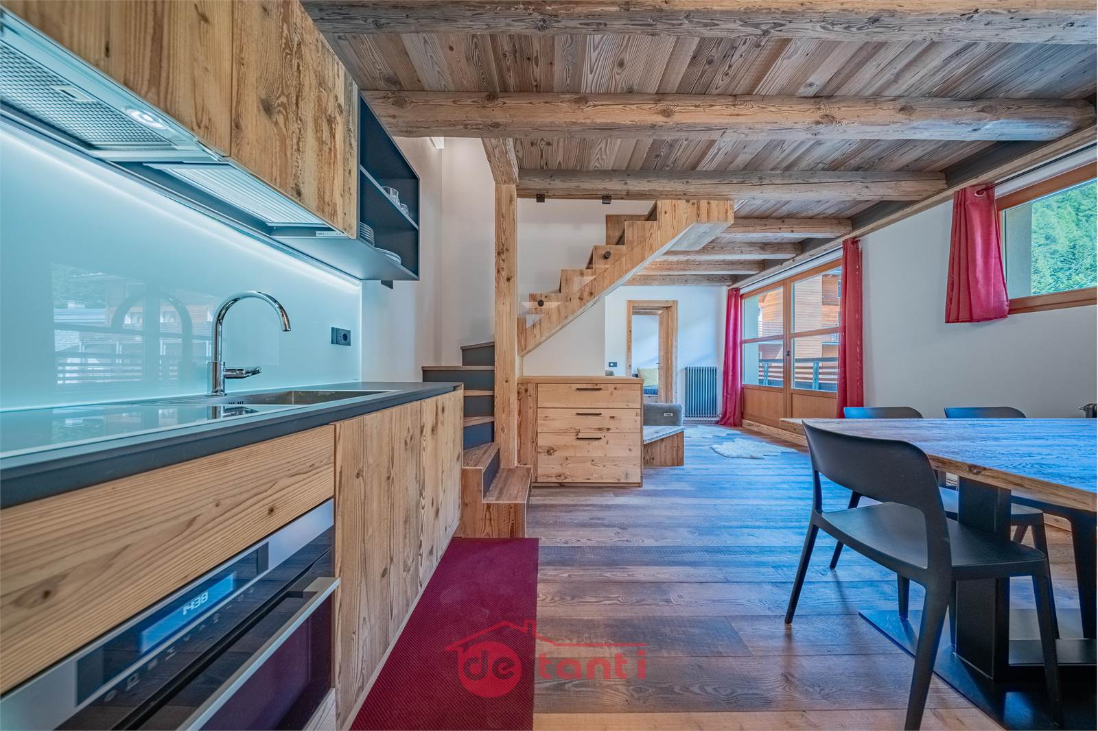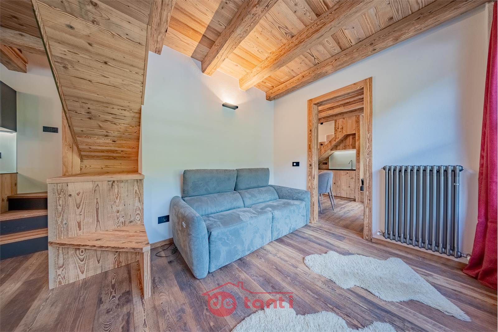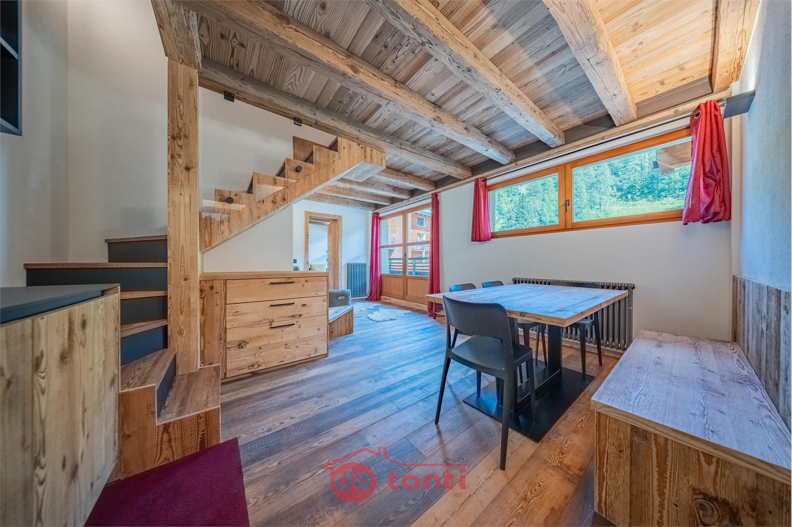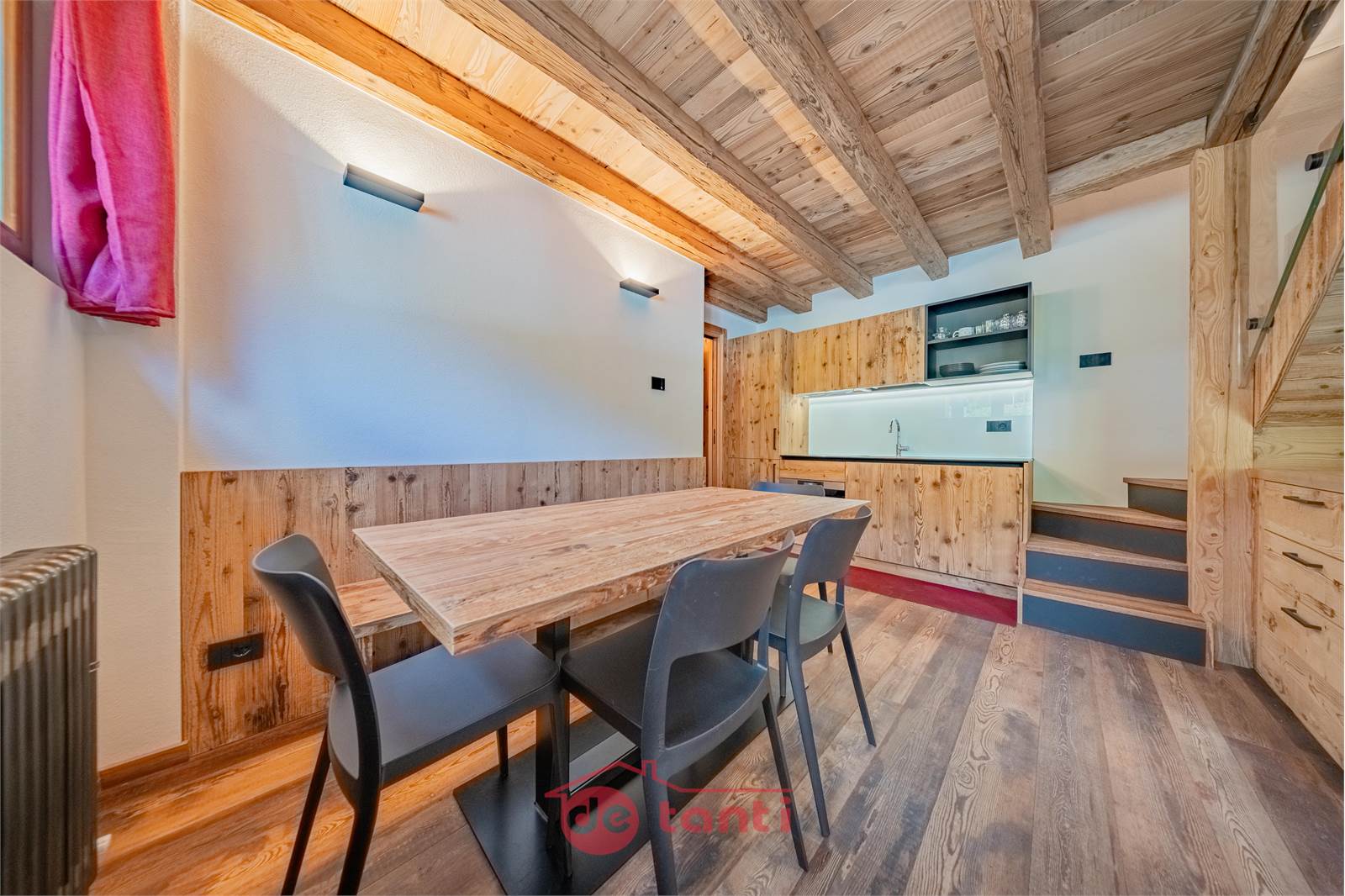 Il progetto di ristrutturazione ha messo al centro luce e legno: travi a vista, boiserie e pavimenti in tavole larghe disegnano un’atmosfera alpina contemporanea; l’illuminazione a LED integrata scalda i volumi e valorizza i dettagli artigianali.