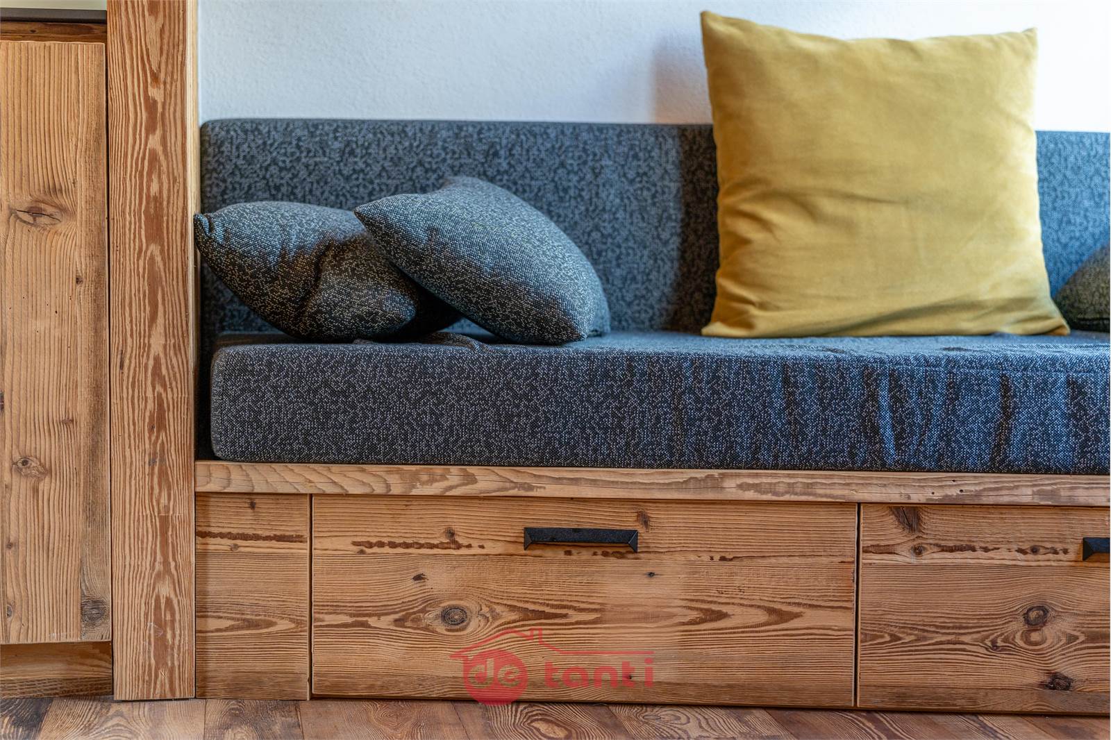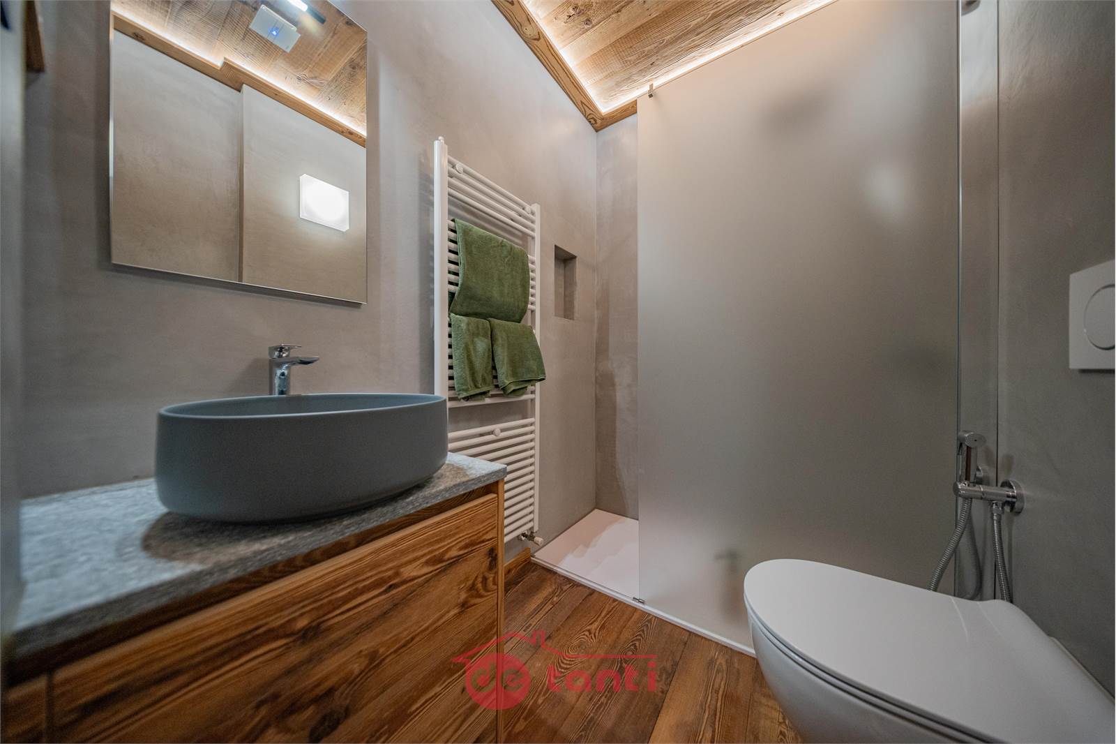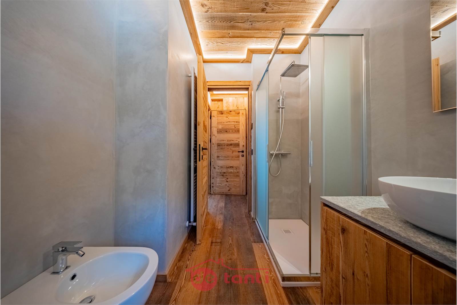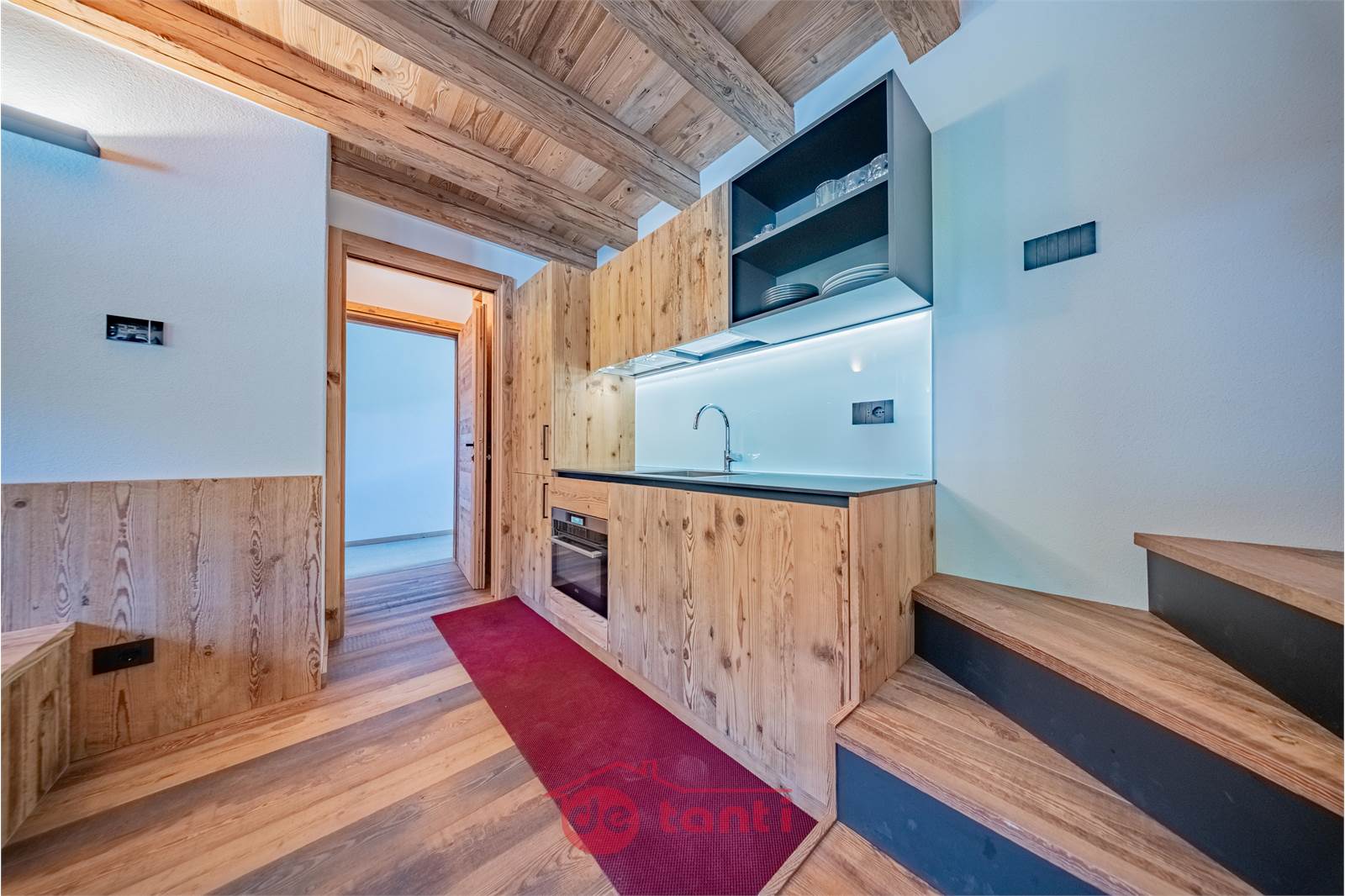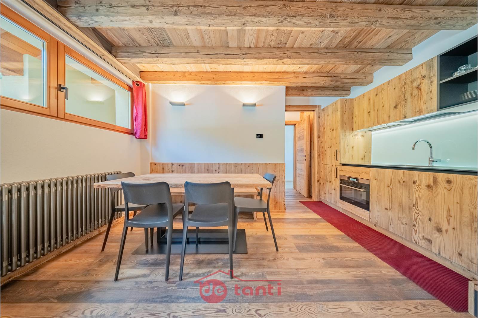 Il progetto di ristrutturazione ha messo al centro luce e legno: travi a vista, boiserie e pavimenti in tavole larghe disegnano un’atmosfera alpina contemporanea; l’illuminazione a LED integrata scalda i volumi e valorizza i dettagli artigianali.