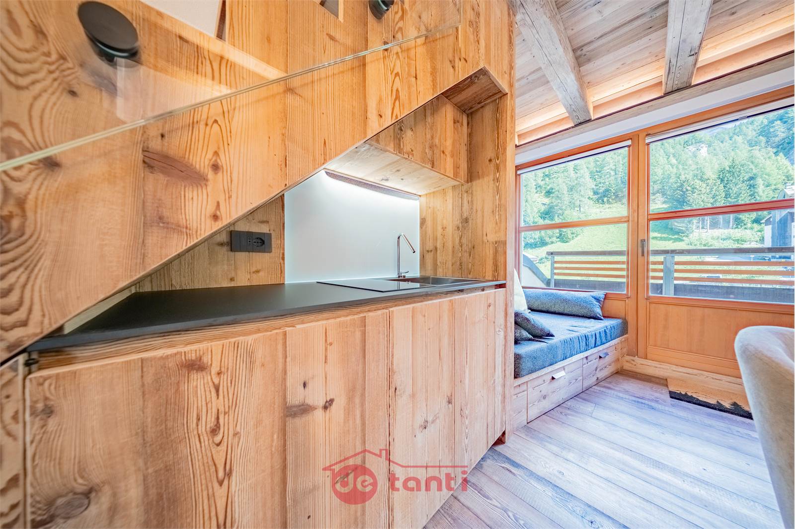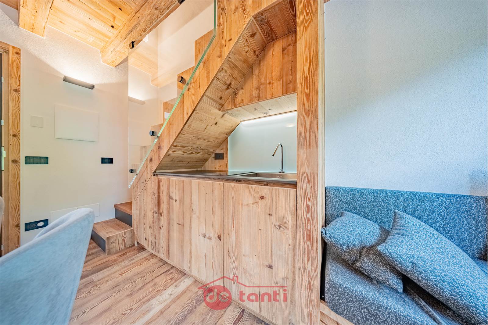 La seconda zona giorno è un salotto indipendente o una mini-suite ideale per ospiti o figli grandi. Qui trovi un cucinino incavato ad arte nel sottoscala che porta alla camera, un divano a due posti e un bagno dedicato, garantendo autonomia e privacy.