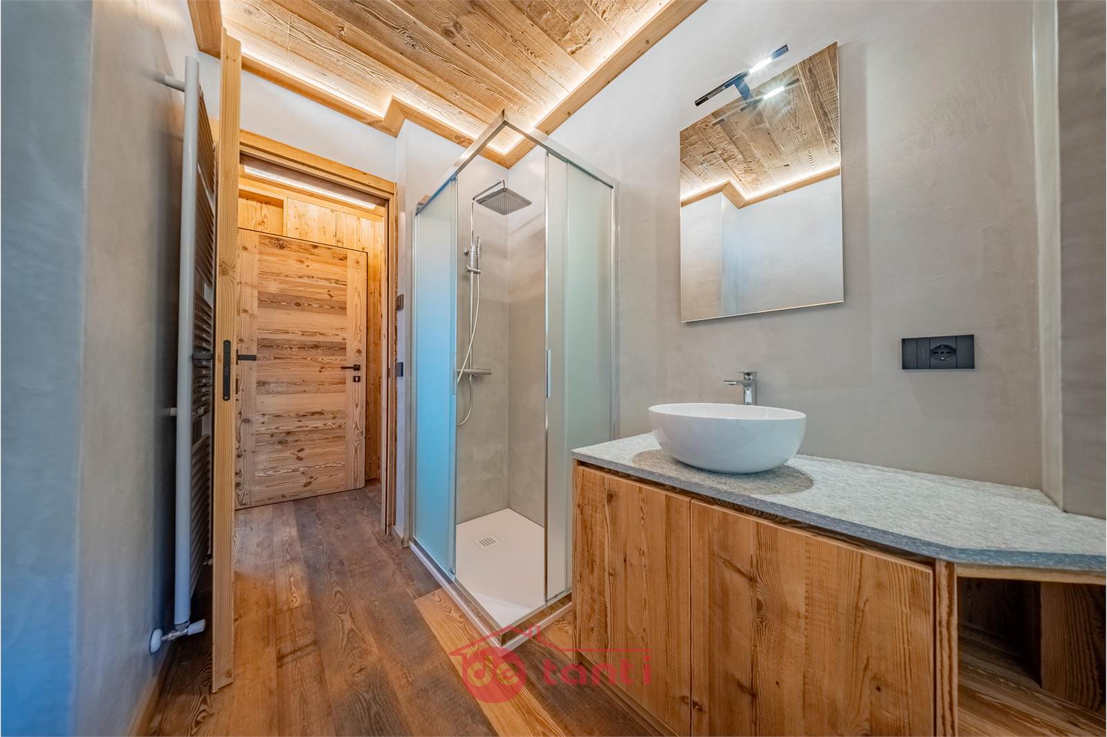 Le finiture raccontano qualità: legni spazzolati coordinati su pavimenti, porte e arredi su misura, giochi di luce integrata e bagno con doccia e superfici materiche facili da mantenere. La terrazza è il vero prolungamento del living e cambia il modo di godersi la casa in ogni stagione.