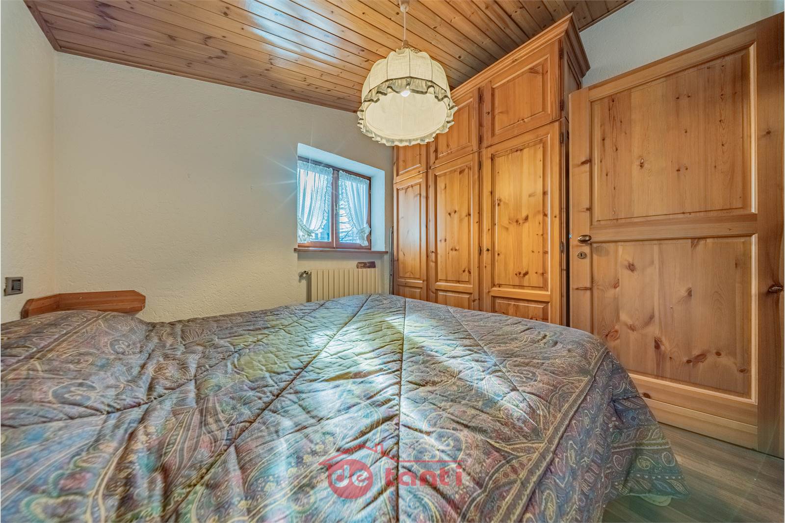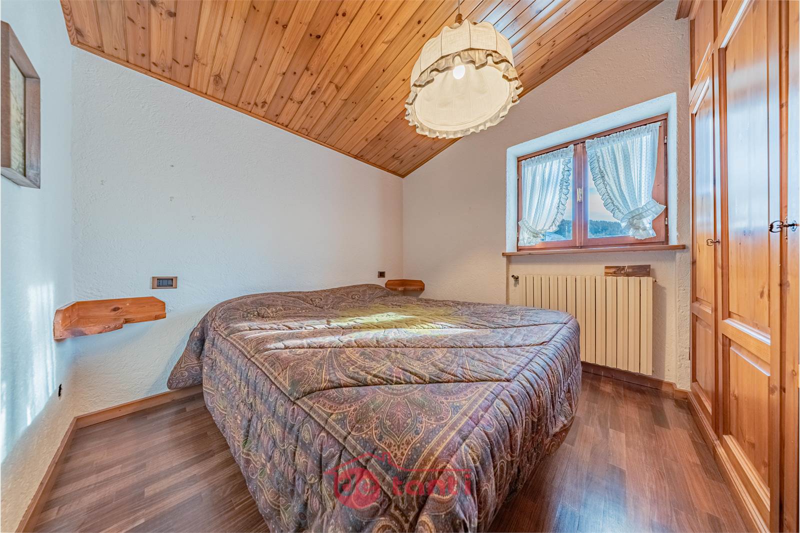 La camera matrimoniale prosegue coerentemente questo racconto fatto di semplicità e calore. Il soffitto in legno avvolge l’ambiente e restituisce immediatamente quella sensazione di rifugio che si cerca in una casa di montagna, uno spazio raccolto, silenzioso, pensato per il riposo vero. Il bagno è completamente funzionante e pronto all’uso, un aspetto tutt’altro che scontato per chi desidera entrare e iniziare subito a vivere la casa, senza programmare interventi o compromessi.