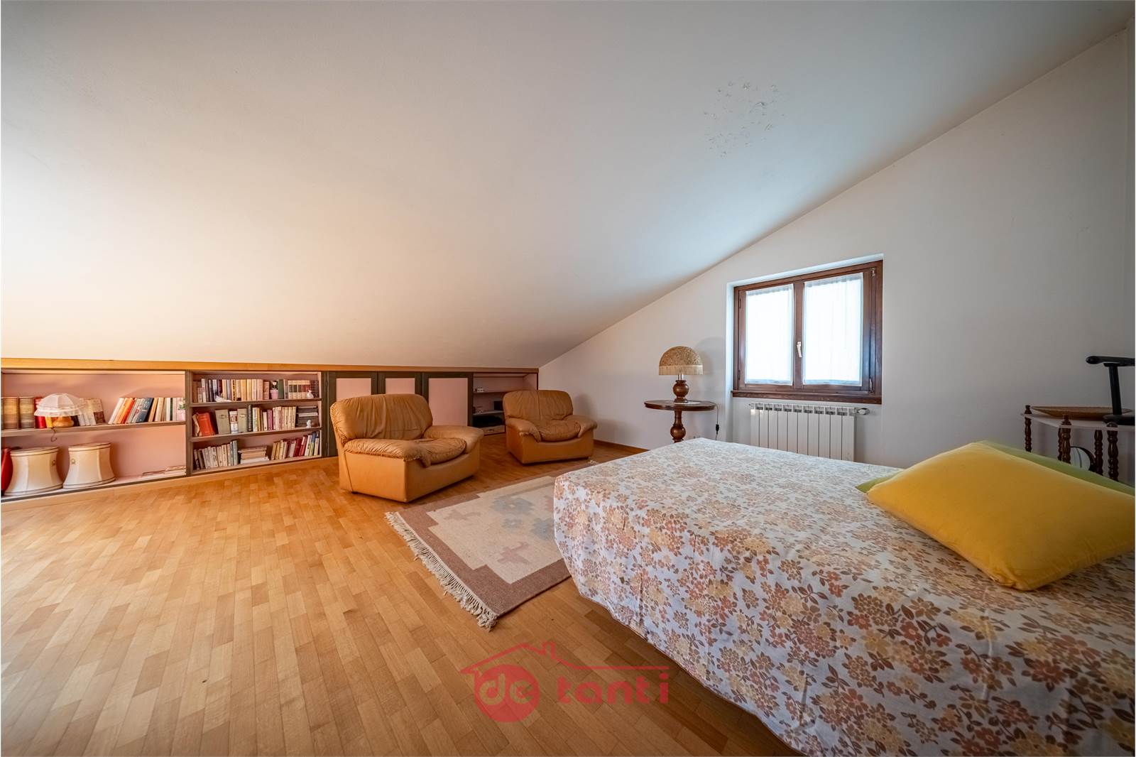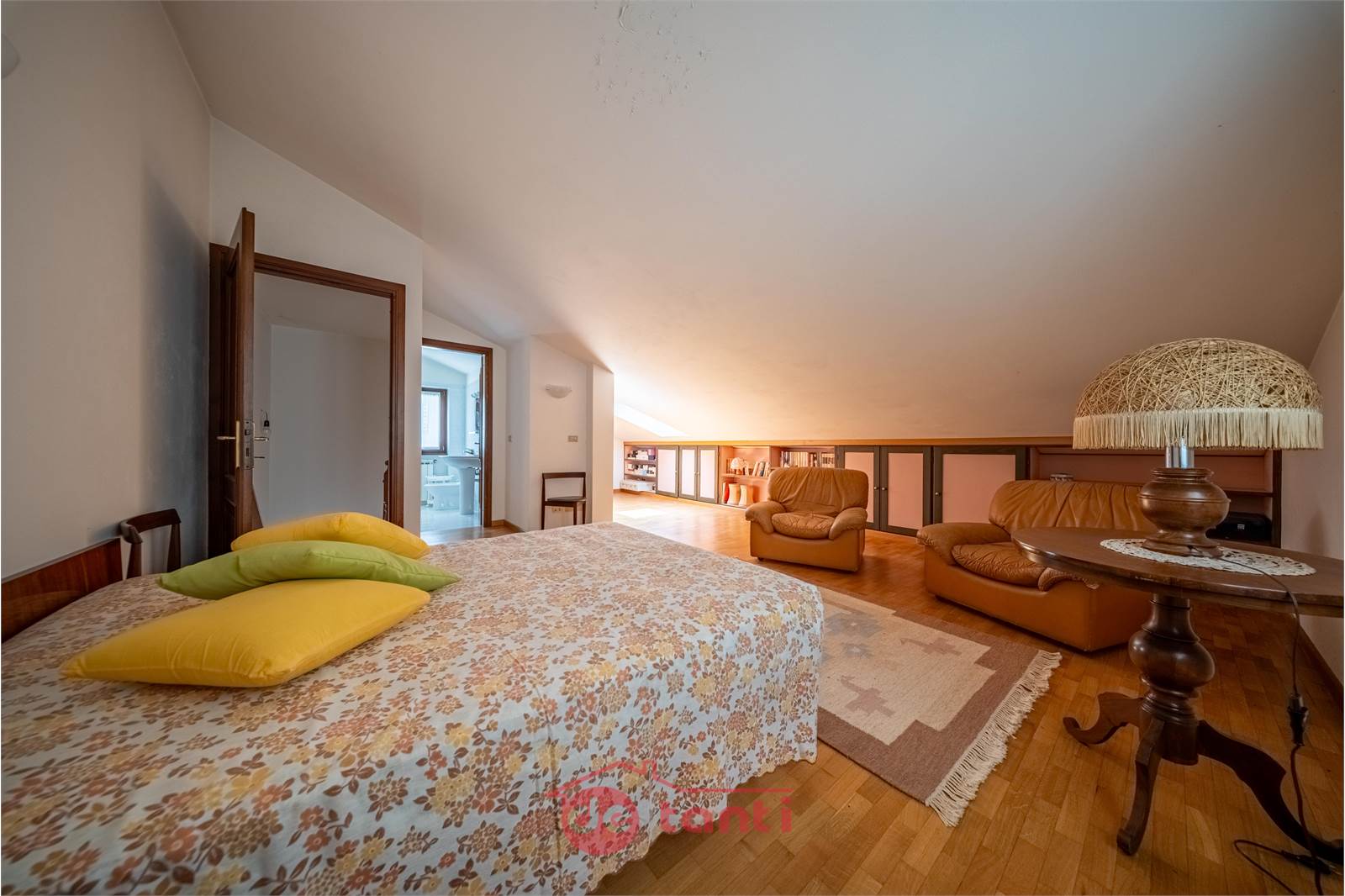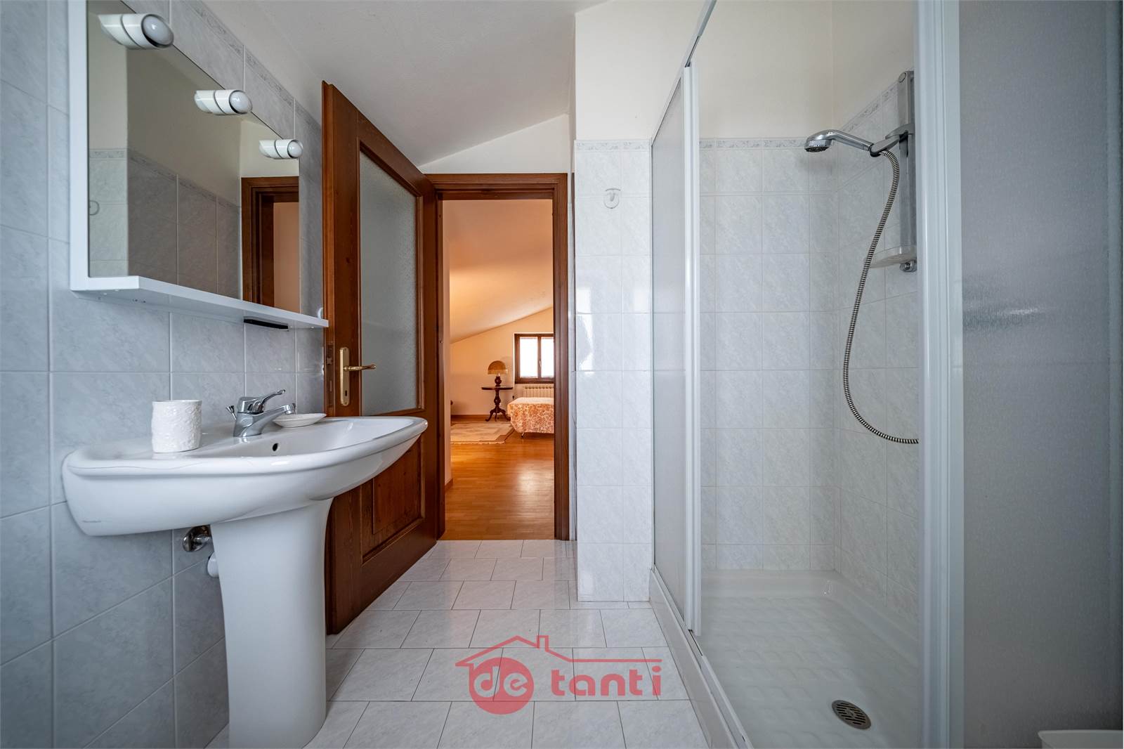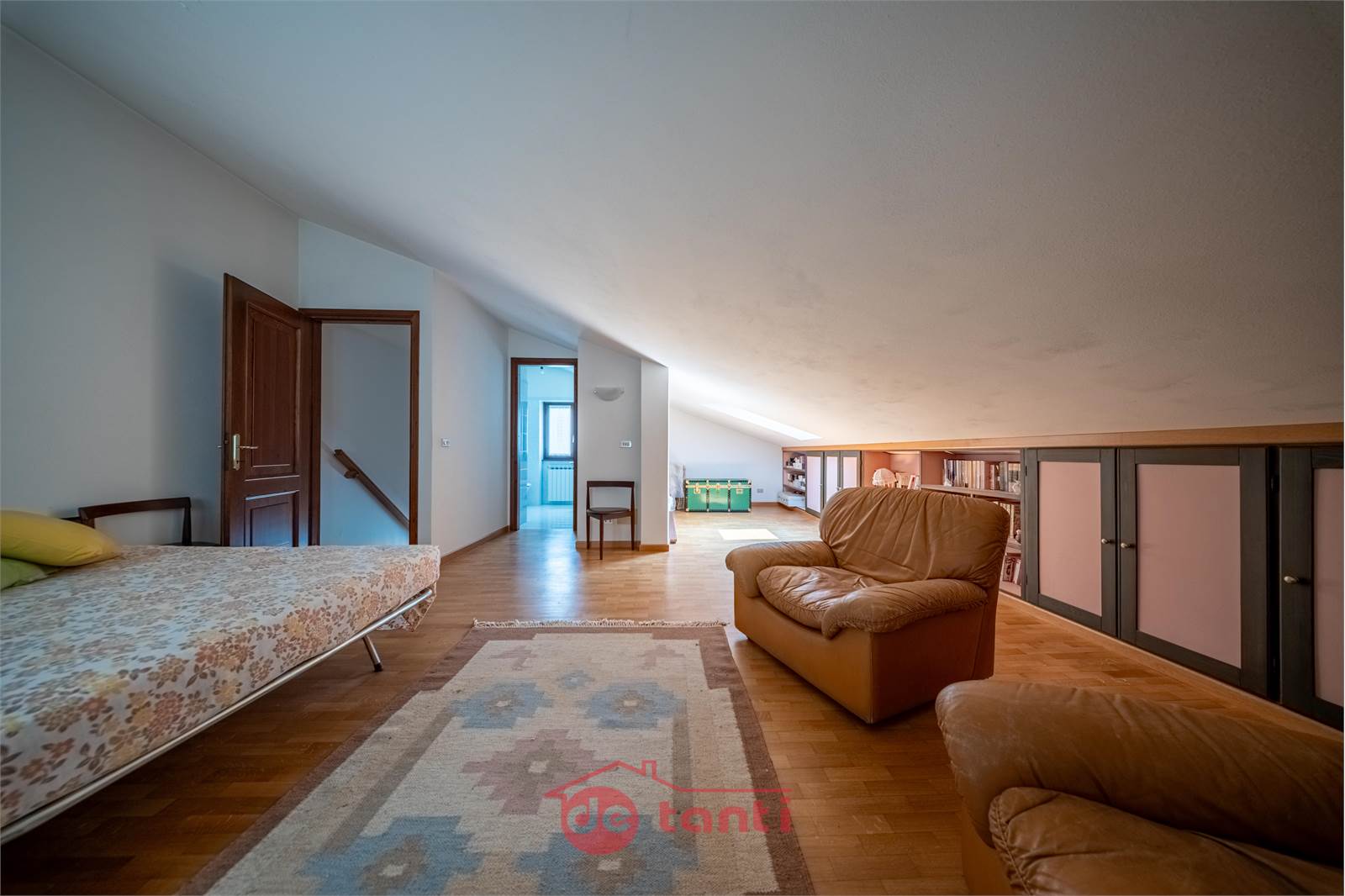 La zona notte, al piano superiore, risponde in modo efficace a una delle esigenze più sentite da chi cerca una casa spaziosa: avere ambienti che possano adattarsi davvero alla crescita della famiglia. Le tre camere offrono una distribuzione versatile, con una matrimoniale, una singola e una terza stanza collegata a un sottotetto rifinito e sorprendentemente utile. È proprio questo uno degli elementi che rendono la casa particolarmente interessante: la possibilità di contare su uno spazio in più, da interpretare nel modo più adatto alle esigenze di oggi o di domani. Può diventare studio, sala giochi, stanza per gli ospiti o zona riservata per un figlio che cresce e chiede maggiore autonomia. Il bagno principale, ampio e ben distribuito, completa il piano con una presenza concreta e comoda per la gestione familiare.