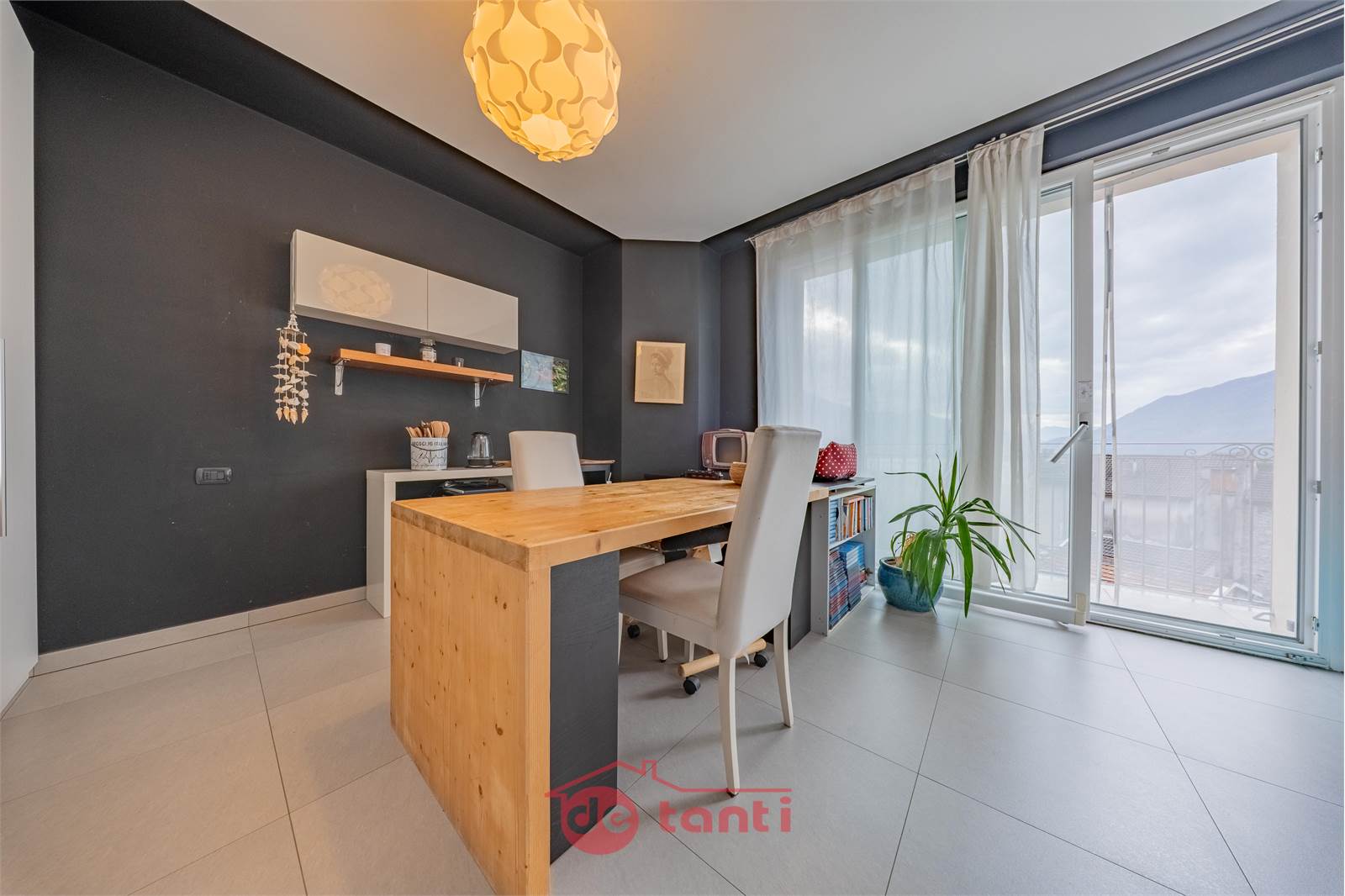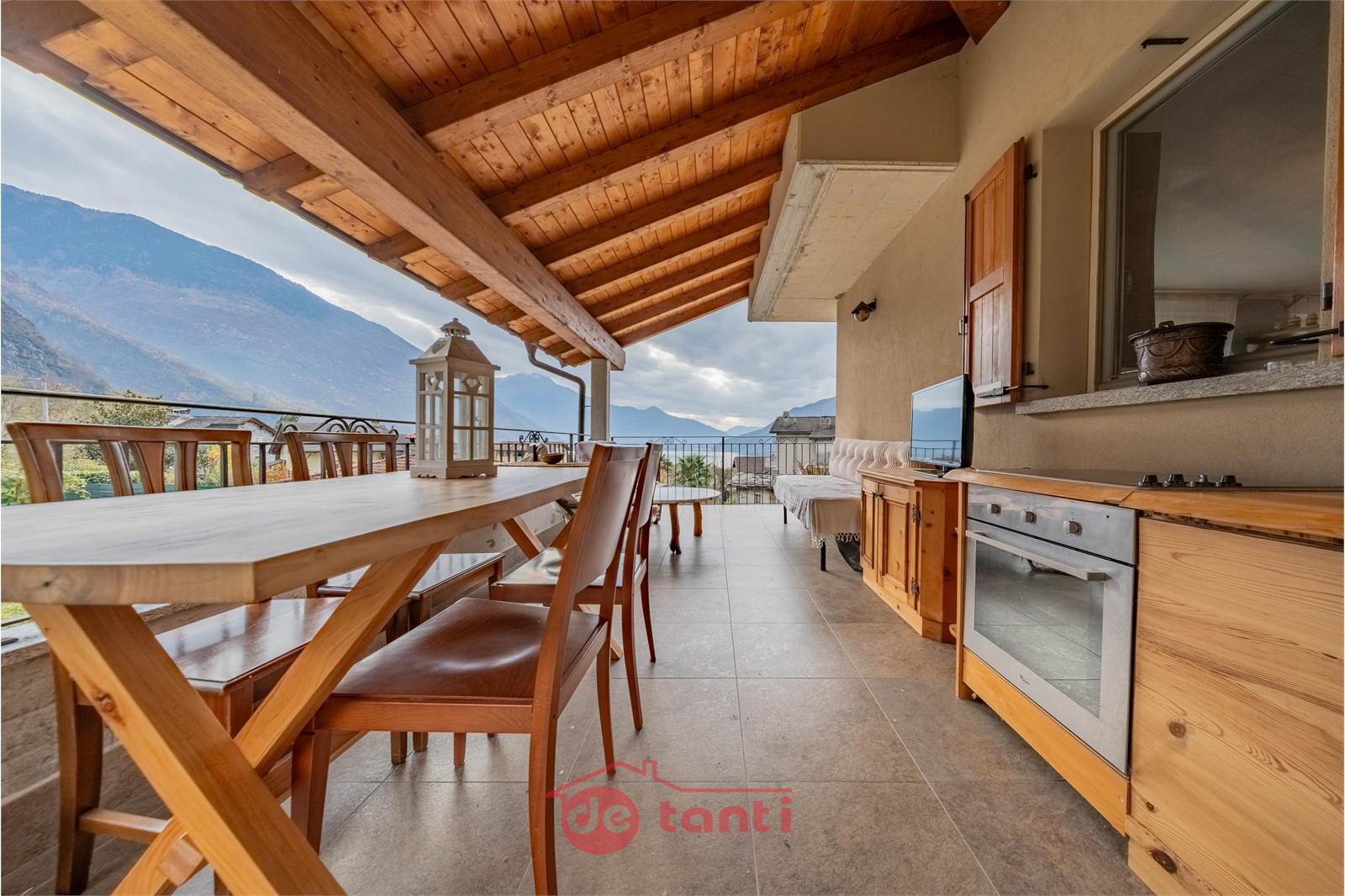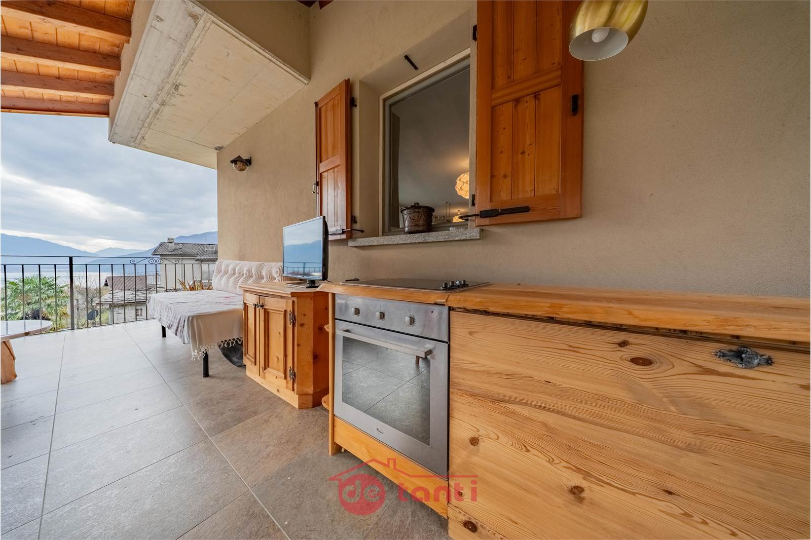 Dalla zona giorno si accede alla grande terrazza coperta, uno degli ambienti che fanno davvero la differenza. Qui la casa si espande: una seconda cucina esterna, lo spazio per pranzi e cene all’aperto, e una vista aperta sul lago di Novate che accompagna i momenti di relax. È uno spazio che non è un semplice sfogo, ma una vera estensione della vita domestica, utilizzabile per buona parte dell’anno.