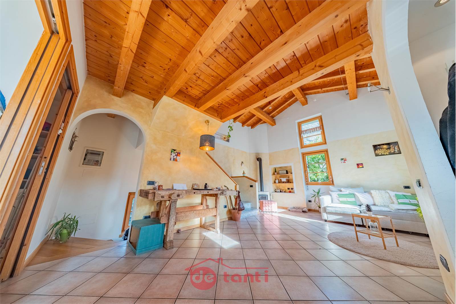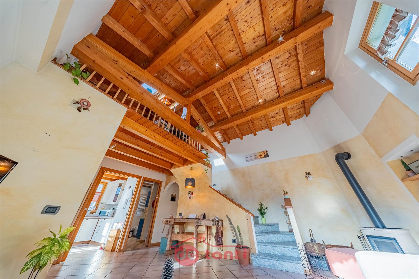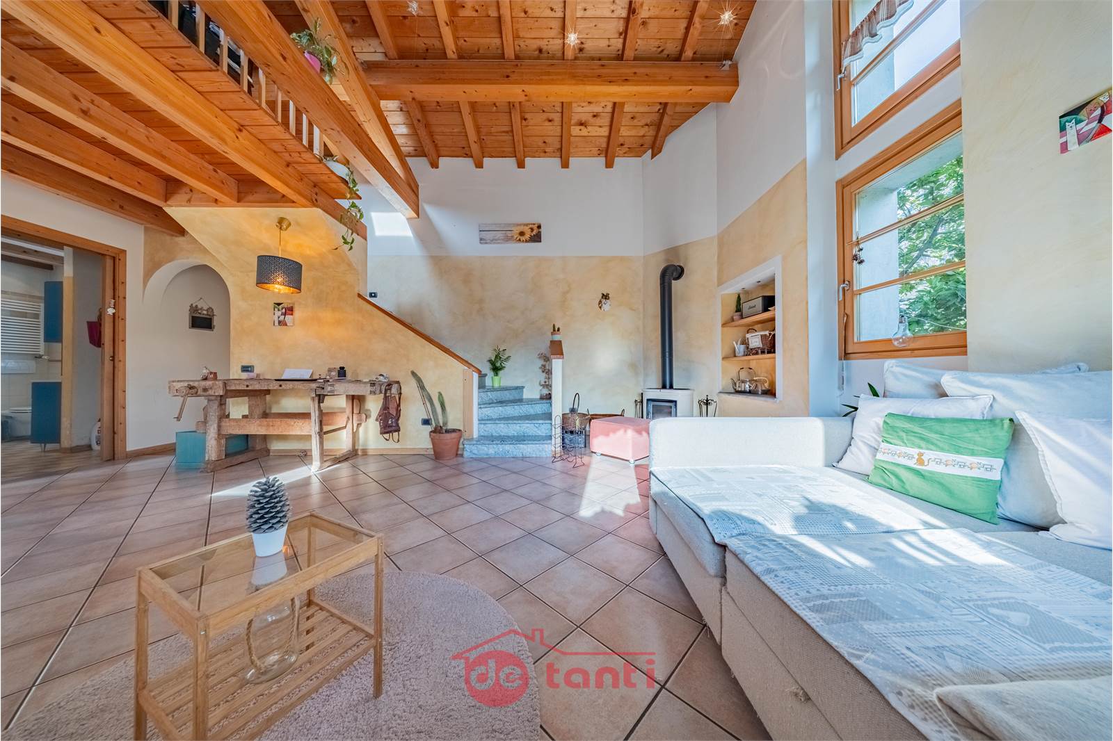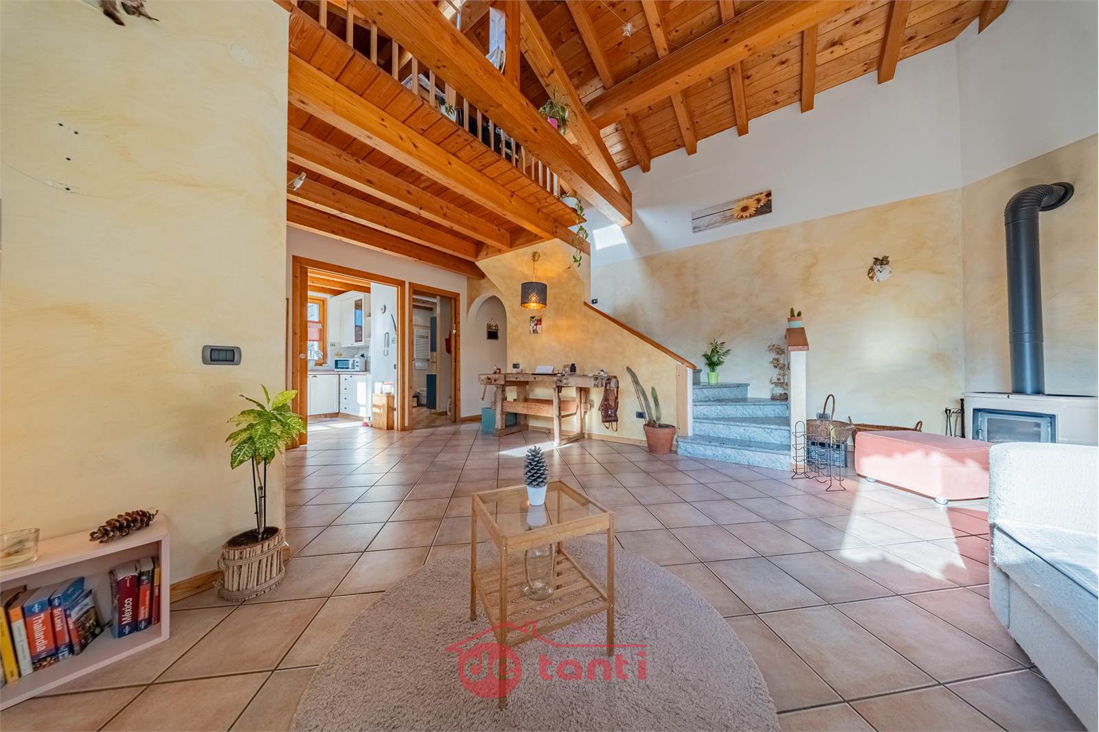 Al primo piano la casa mostra uno dei suoi aspetti più affascinanti: una zona giorno ampia, ariosa e ricca di personalità, impreziosita dalla doppia altezza e da un bellissimo soffitto in legno a vista che rende l’ambiente scenografico ma allo stesso tempo autentico e caldo. Qui la luce entra generosa e accompagna ogni momento della giornata, creando un’atmosfera che sa essere conviviale, rilassante e familiare. È il tipo di spazio in cui ci si immagina con naturalezza una quotidianità piena, fatta di colazioni lente, pomeriggi luminosi, serate insieme e momenti da condividere.