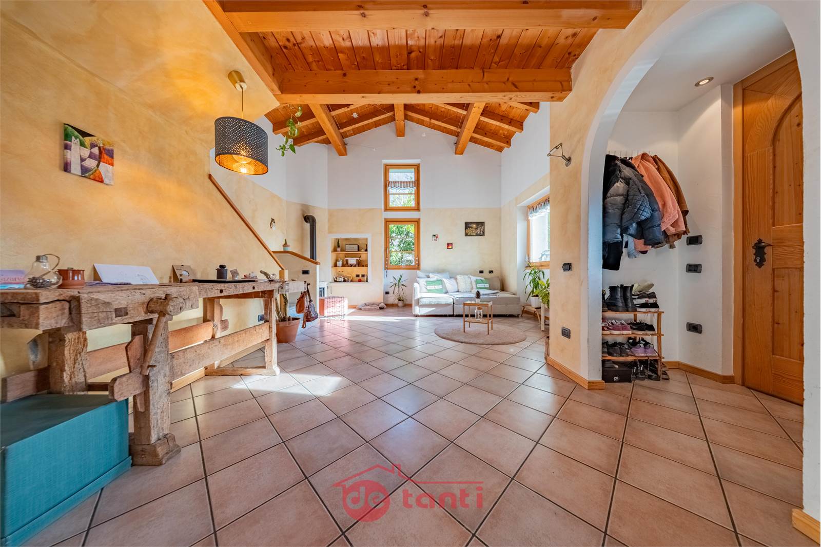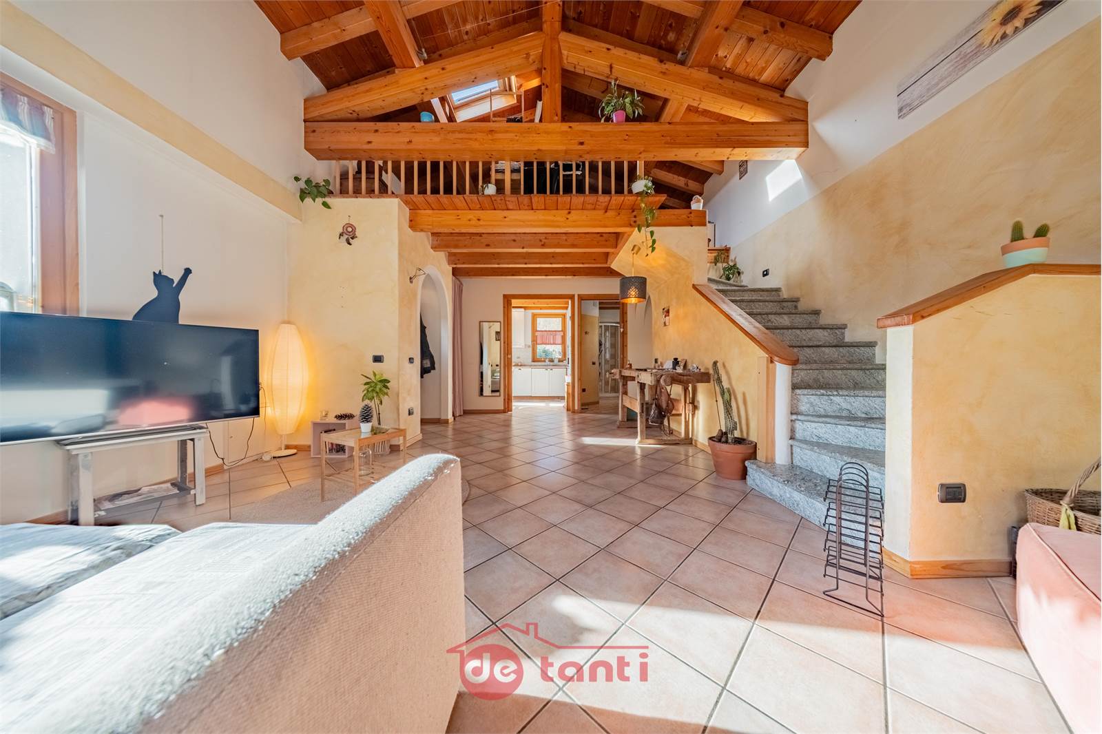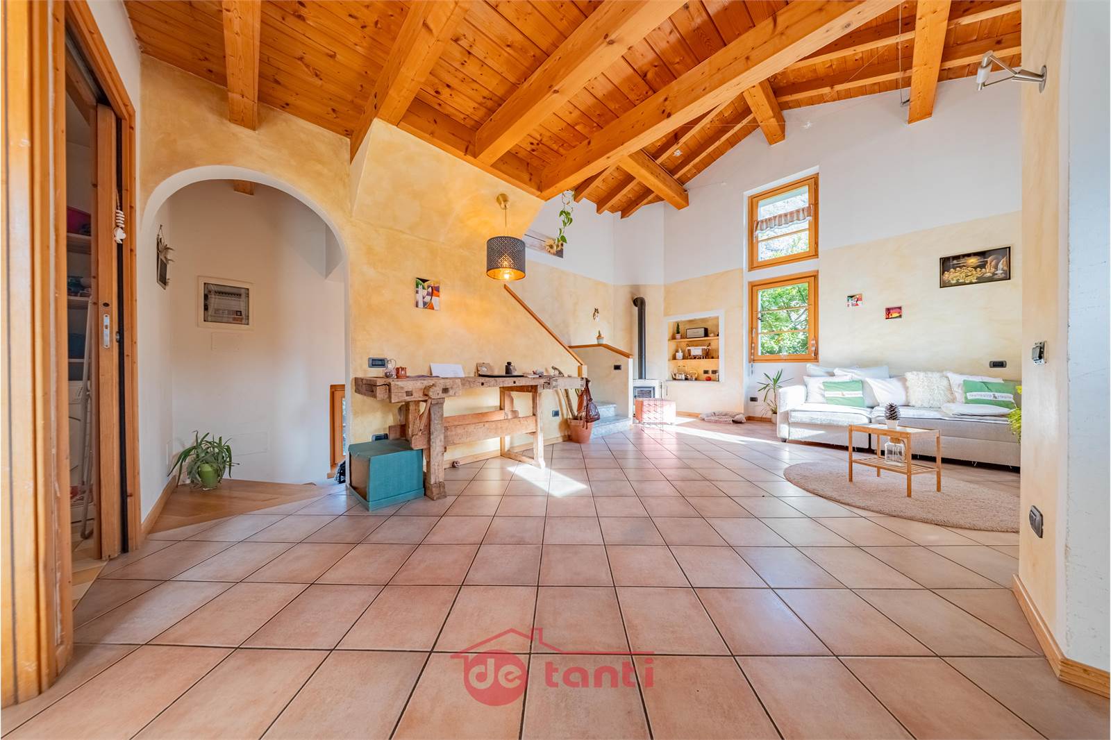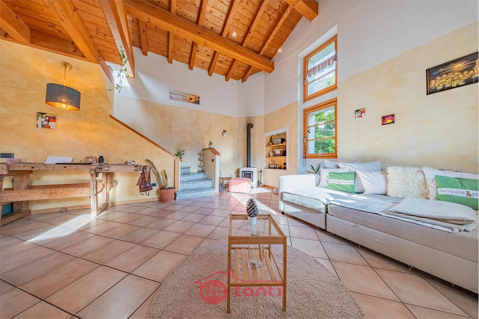 Al primo piano la casa mostra uno dei suoi aspetti più affascinanti: una zona giorno ampia, ariosa e ricca di personalità, impreziosita dalla doppia altezza e da un bellissimo soffitto in legno a vista che rende l’ambiente scenografico ma allo stesso tempo autentico e caldo. Qui la luce entra generosa e accompagna ogni momento della giornata, creando un’atmosfera che sa essere conviviale, rilassante e familiare. È il tipo di spazio in cui ci si immagina con naturalezza una quotidianità piena, fatta di colazioni lente, pomeriggi luminosi, serate insieme e momenti da condividere.