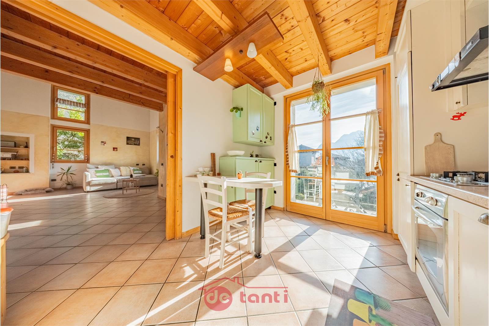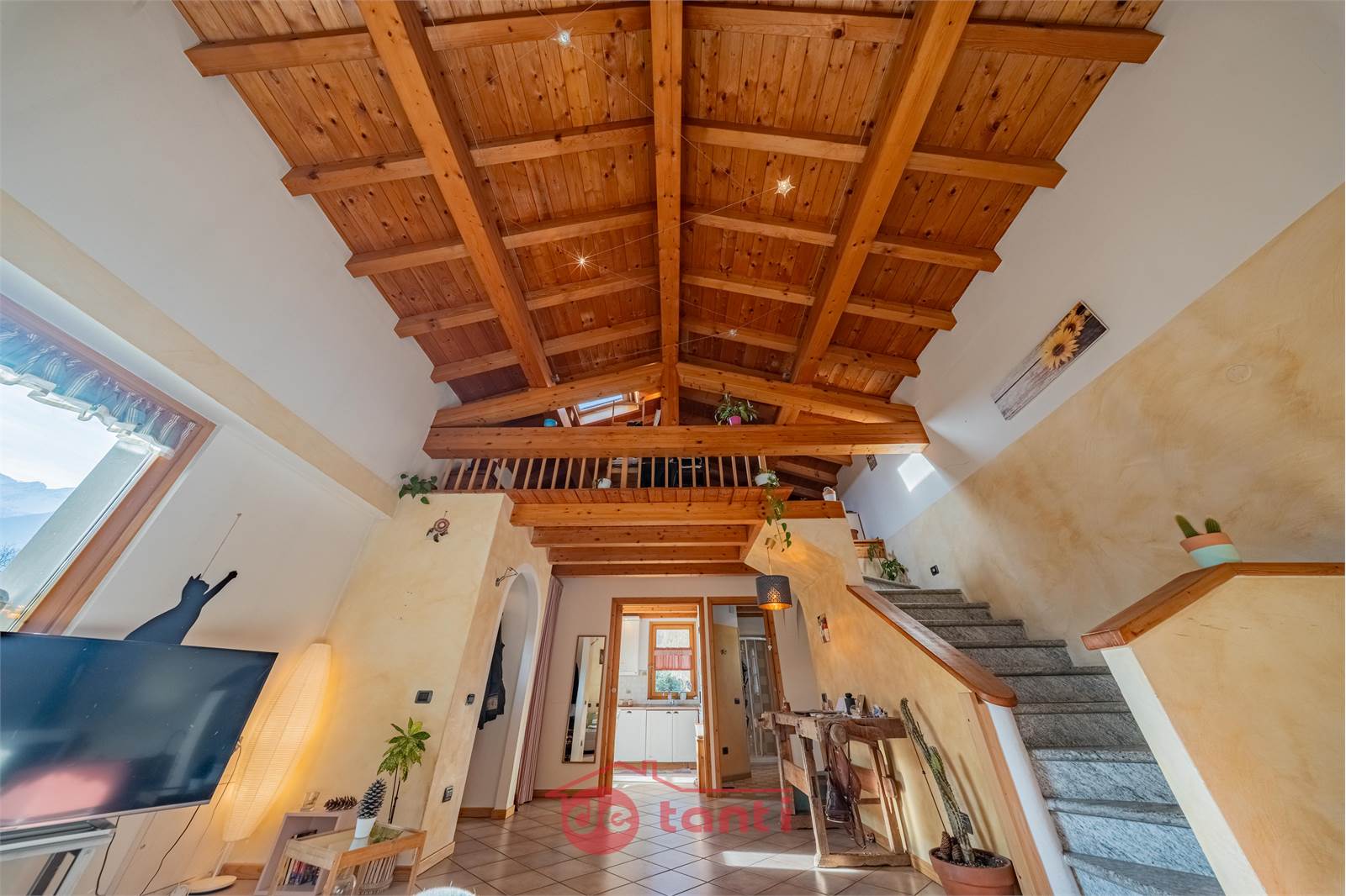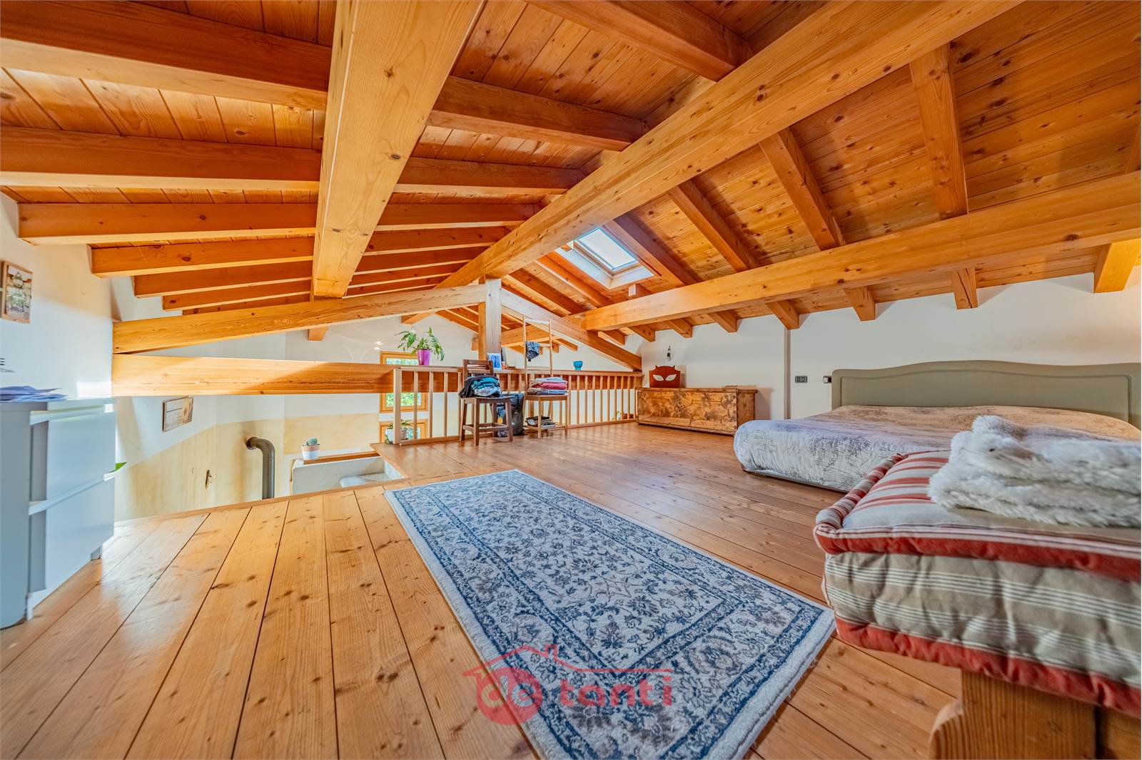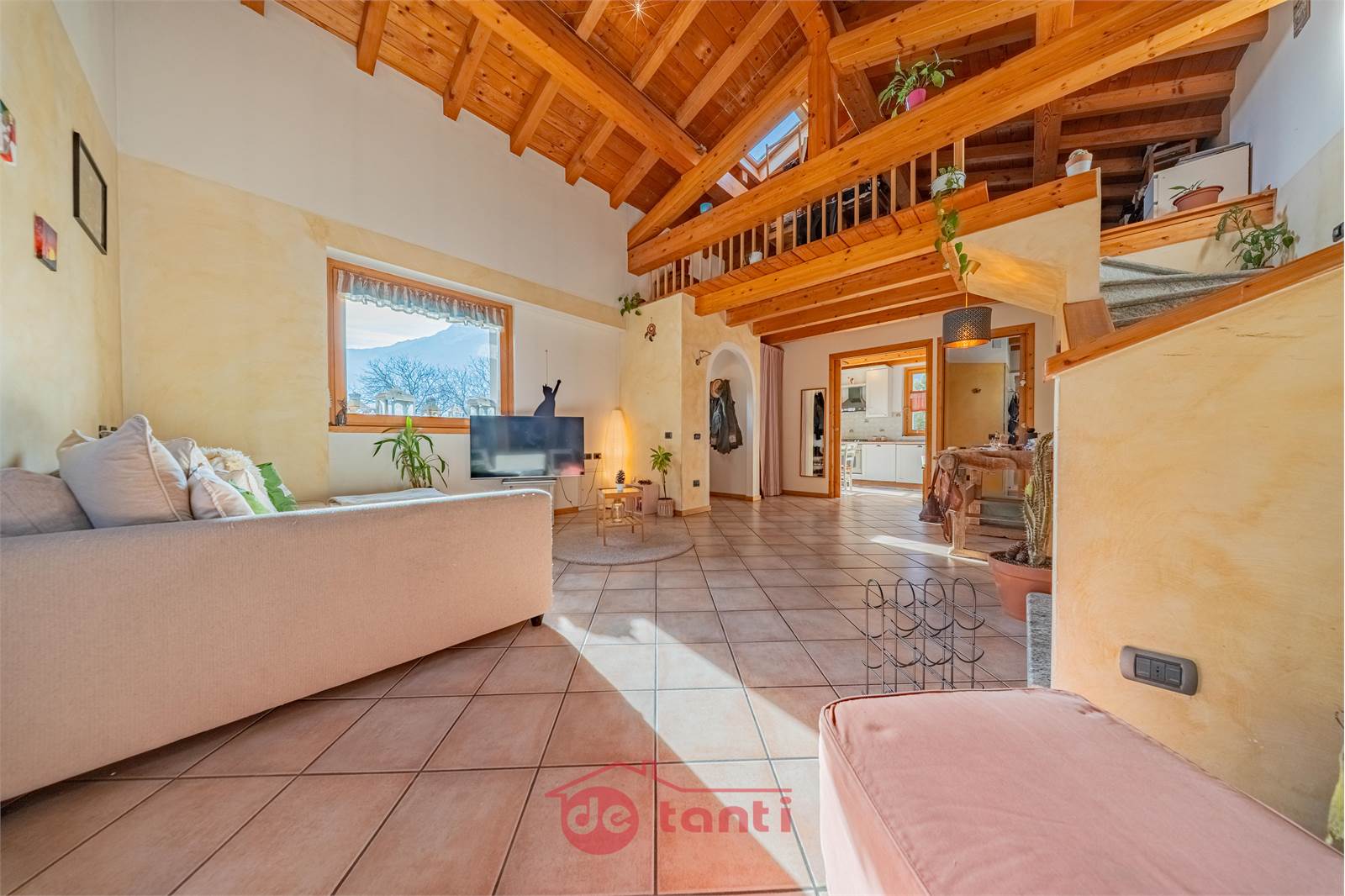 Al primo piano la casa mostra uno dei suoi aspetti più affascinanti: una zona giorno ampia, ariosa e ricca di personalità, impreziosita dalla doppia altezza e da un bellissimo soffitto in legno a vista che rende l’ambiente scenografico ma allo stesso tempo autentico e caldo. Qui la luce entra generosa e accompagna ogni momento della giornata, creando un’atmosfera che sa essere conviviale, rilassante e familiare. È il tipo di spazio in cui ci si immagina con naturalezza una quotidianità piena, fatta di colazioni lente, pomeriggi luminosi, serate insieme e momenti da condividere.